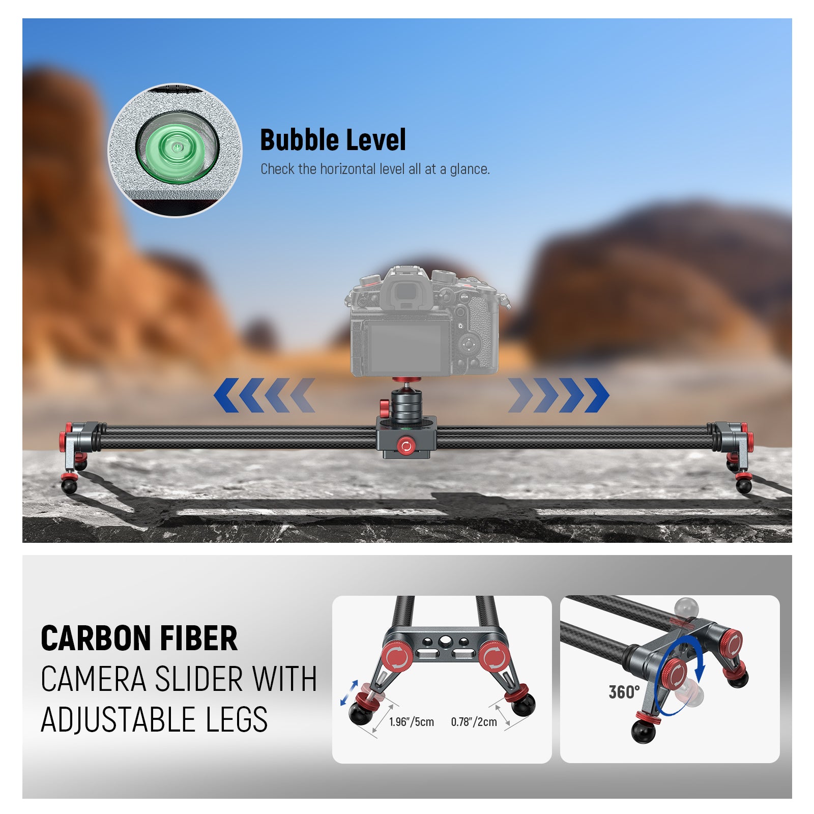 - Slider de caméra en fibre de carbone avec pieds réglables - Fabriqué en fibre de carbone et en alliage d'aluminium, ce slider de caméra supporte une charge stable jusqu'à 2 kg horizontalement, 1 kg à 45° d'inclinaison et 1 kg verticalement. Ses pieds réglables à 360° offrent une plus grande flexibilité d'angles et peuvent être surélevés de 2 à 5 cm pour un équilibre optimal sur les terrains accidentés. Le niveau à bulle intégré permet de vérifier rapidement l'horizontalité.