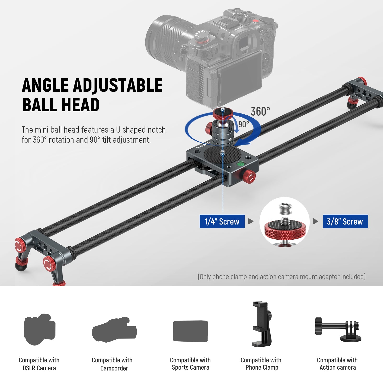 - Rotule orientable - Cette mini rotule est dotée d'une encoche en U permettant une rotation à 360° et une inclinaison à 90°. Sa vis supérieure de 6,35 mm (1/4") est compatible avec les appareils photo reflex numériques Canon, Nikon, Sony, Panasonic et Samsung, les caméscopes DV, les appareils photo hybrides, les caméras d'action, les smartphones (adaptateur pour smartphone et pour caméra d'action inclus), et bien plus encore.