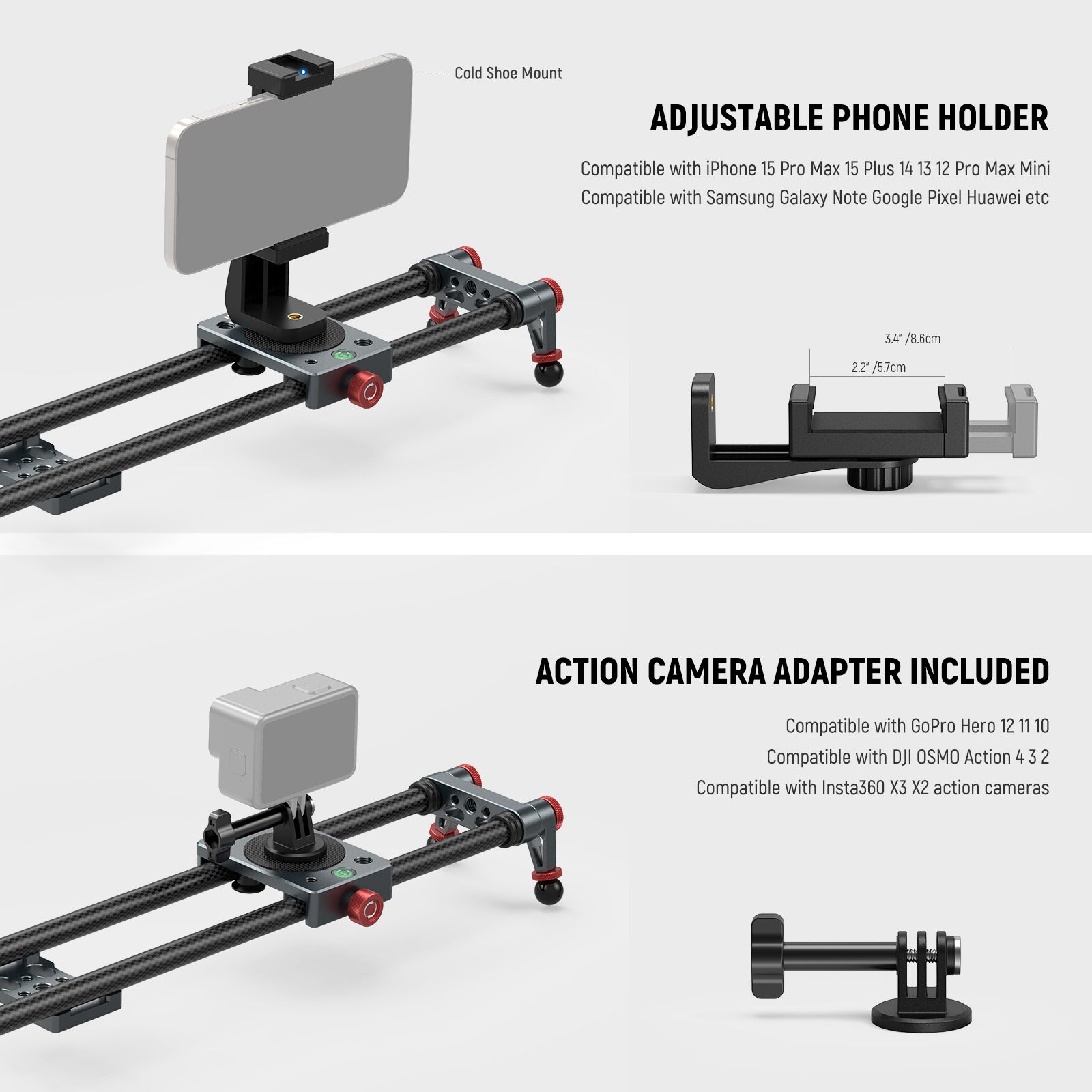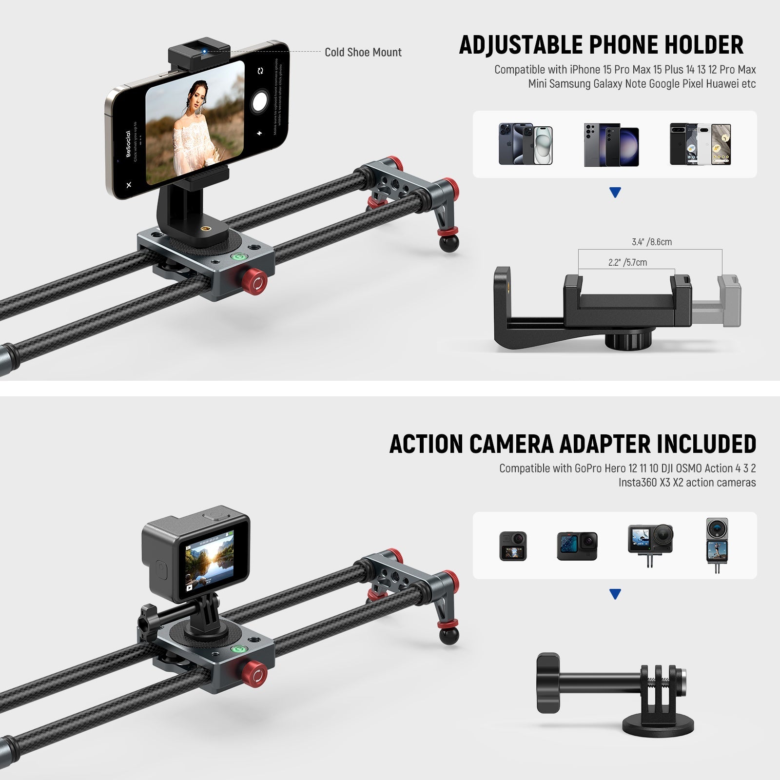 - Support pour téléphone et caméra d'action - Le support de téléphone rotatif offre une flexibilité à 360° et dispose d'un filetage supplémentaire de 6,35 mm (1/4") ainsi que d'une griffe porte-accessoires pour éclairage LED ou microphone. La pince pour téléphone réglable (5,7 à 8,6 cm) est compatible avec les iPhone 16, 15 Pro Max, 15 Plus, 14, 13, 12 Pro Max Mini, Samsung Galaxy Note, Google Pixel, Huawei, etc. L'adaptateur pour caméra d'action est compatible avec les caméras GoPro Hero 13, 12, 11, 10, DJI OSMO Action 4, 3, 2 et Insta360 X3 et X2.