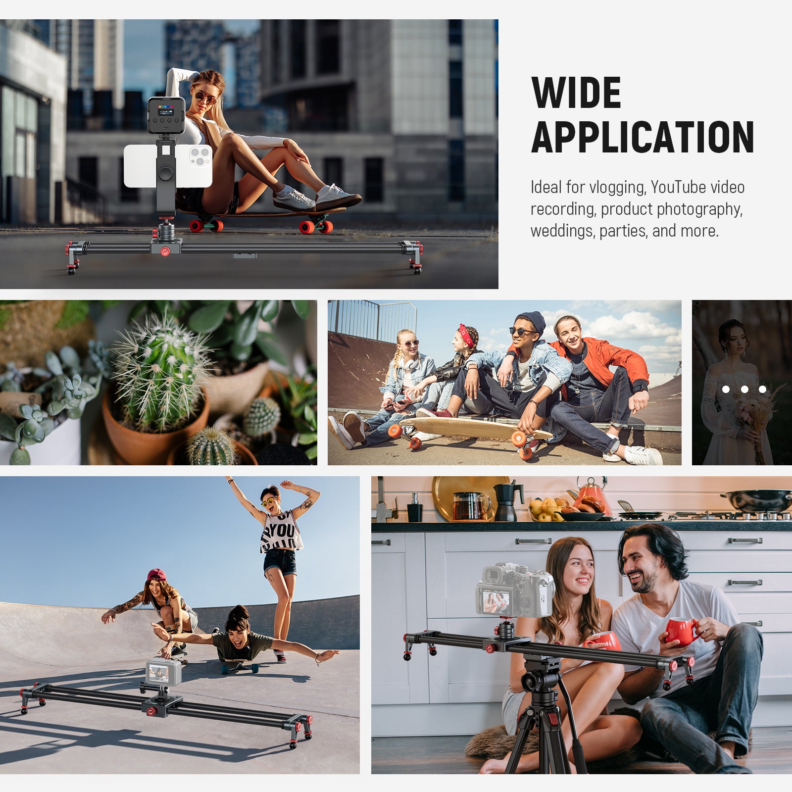 - Glissement fluide et silencieux et fixation polyvalente : grâce à ses 4 roulements de haute précision, le chariot glisse en douceur le long du rail de 40 cm (16 pouces) pour des vidéos fluides et silencieuses, sans distractions. Son positionnement est aisé grâce à la molette de tension latérale. Doté de pas de vis 1/4" et 3/8" à sa base et à chaque extrémité, ce slider vidéo peut être monté sur un trépied ou un pied d'éclairage et permettre des prises de vue horizontales, verticales ou inclinées à 45°.