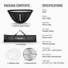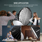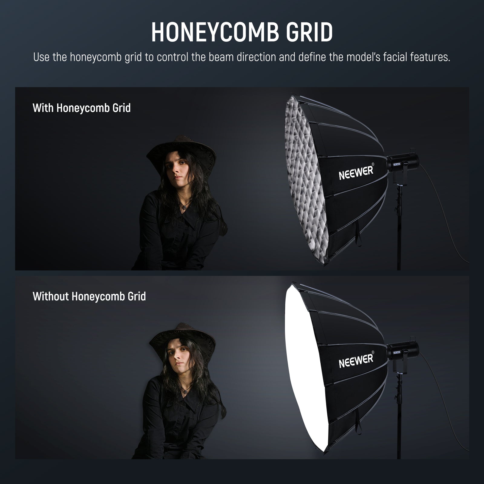 - Grille nid d'abeille et diffuseurs - Le kit d'éclairage softbox comprend des diffuseurs internes et externes, combinables pour une lumière encore plus douce et diffuse. La grille nid d'abeille dirige la lumière à 45° et réduit la diffusion, offrant un éclairage à la fois doux et percutant qui met en valeur les traits du visage du modèle.