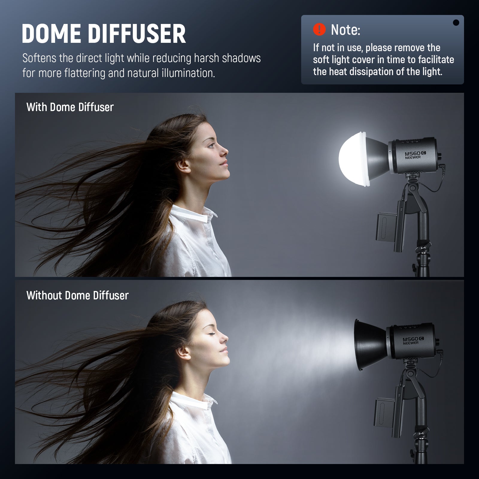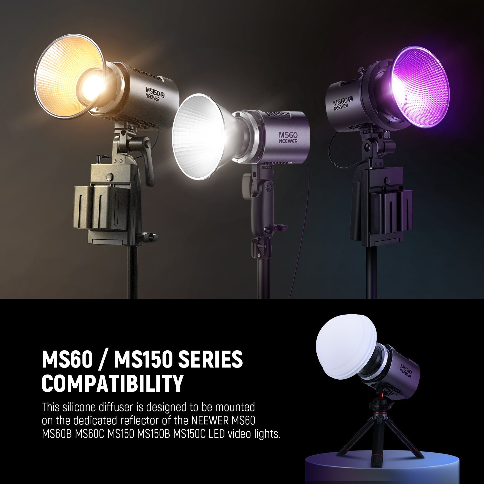 - Pour les projecteurs COB NEEWER MS60/150 : ce dôme de diffusion en silicone est conçu exclusivement pour se monter sur le réflecteur dédié des projecteurs vidéo LED NEEWER MS60, MS60B, MS60C et MS150, MS150B et MS150C.