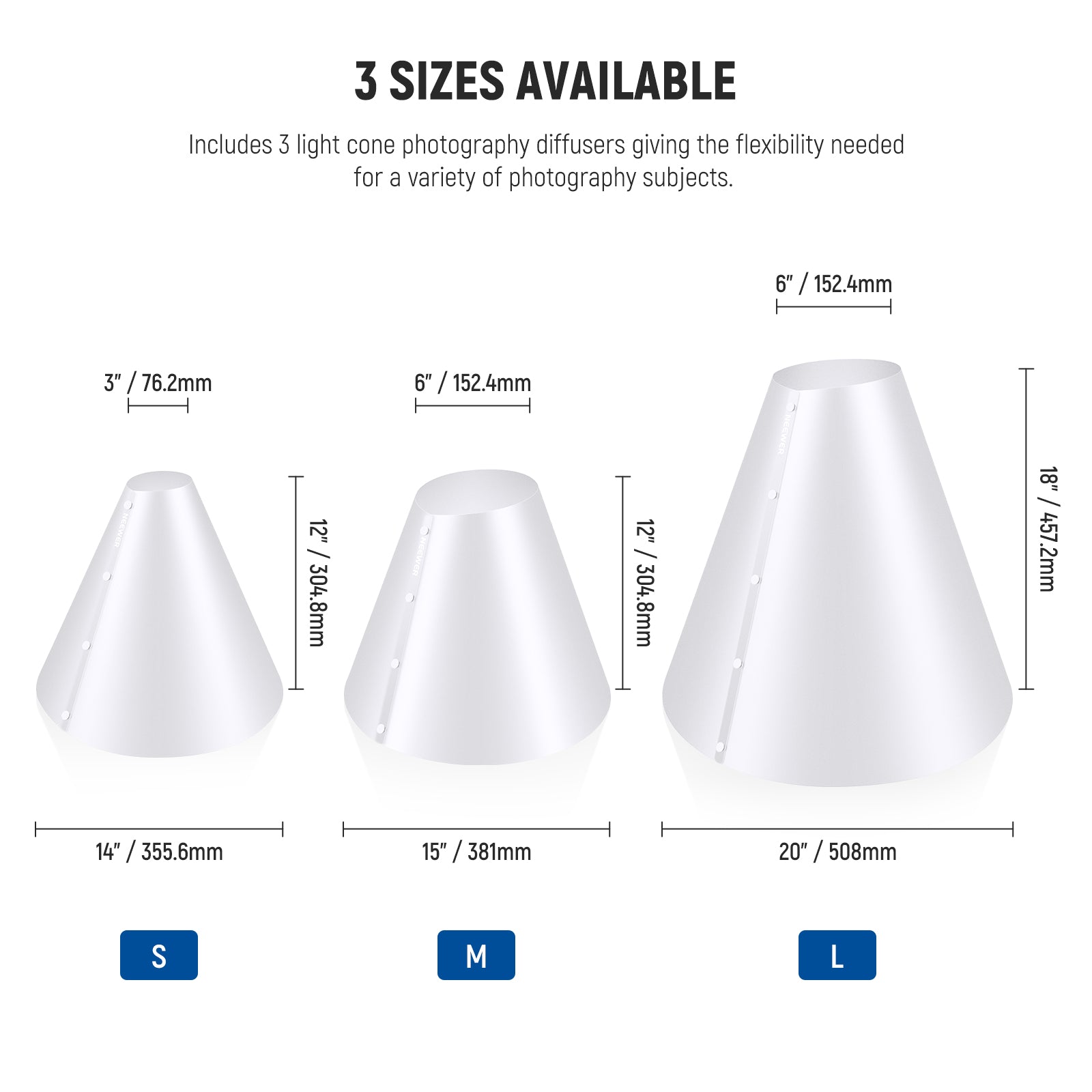 - Disponibles en 3 tailles , ces diffuseurs de lumière coniques (356 mm, 381 mm et 508 mm) offrent une grande flexibilité pour photographier une grande variété de sujets. Idéaux pour mettre en valeur bagues, colliers, bijoux, montres, rouges à lèvres et autres petits objets réfléchissants, ils conviennent également aux produits réfléchissants du quotidien comme les robinets, les douches, les bouilloires, les grille-pain et les sèche-cheveux. Même le plus petit diffuseur est compatible avec l'iPhone 15 pour une présentation parfaite de vos produits.
