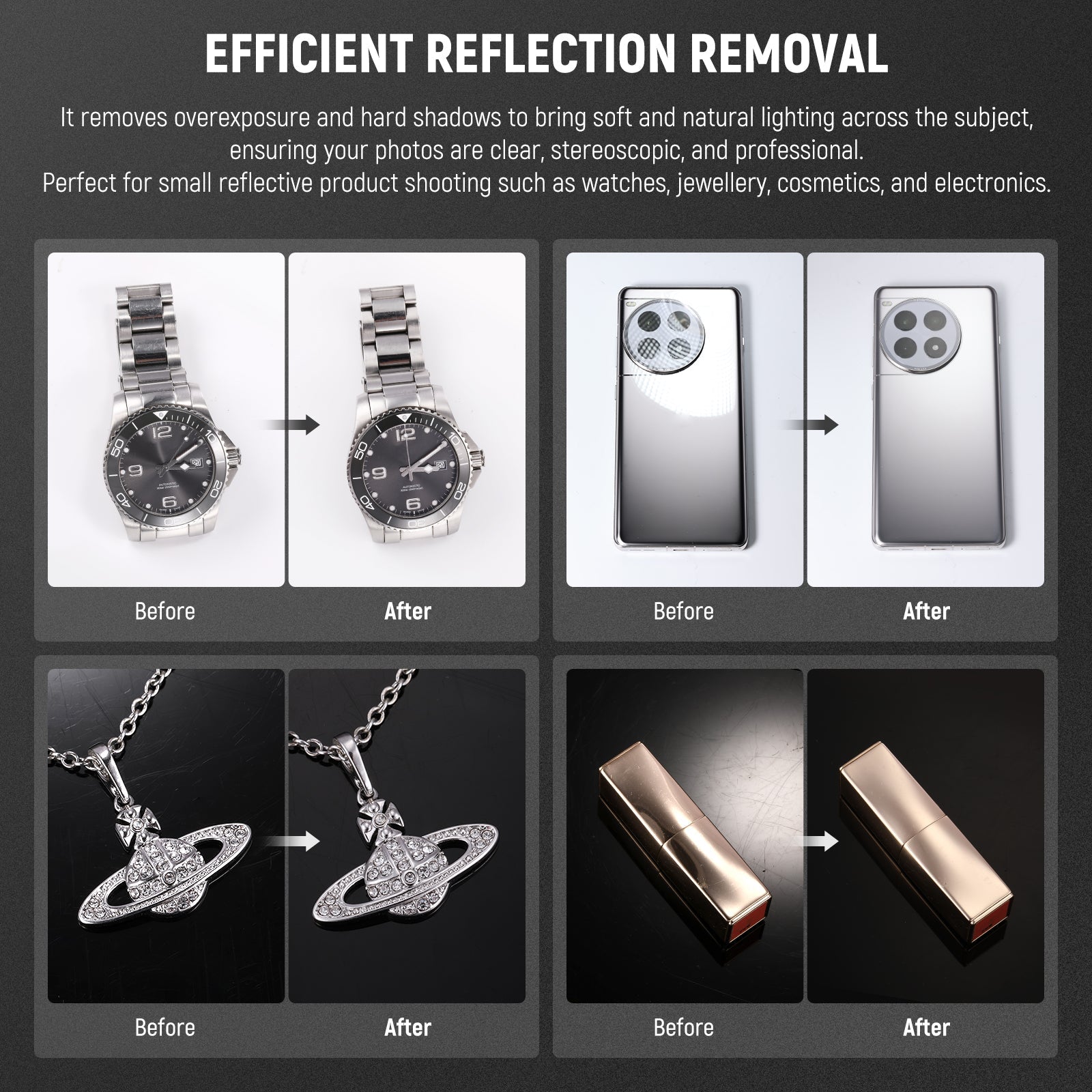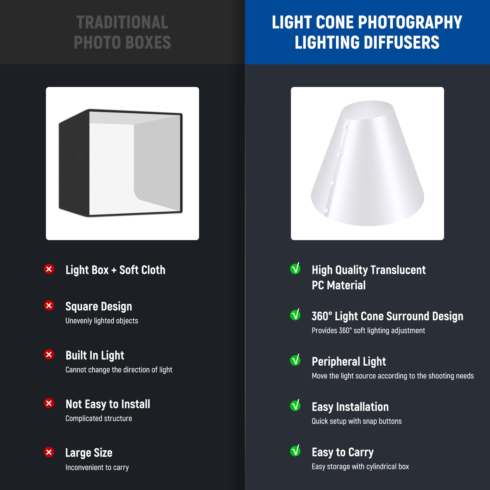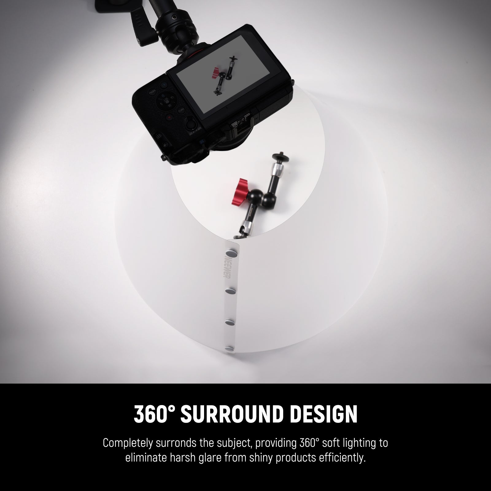 - Conception à cône lumineux à 360° - Le cône lumineux à 360° entoure le sujet, offrant un éclairage doux et ajustable à 360° pour éliminer efficacement les reflets gênants des produits brillants. L'ouverture supérieure inclinée facilite la prise de vue et offre des angles variés pour capturer les meilleurs clichés de vos sujets.