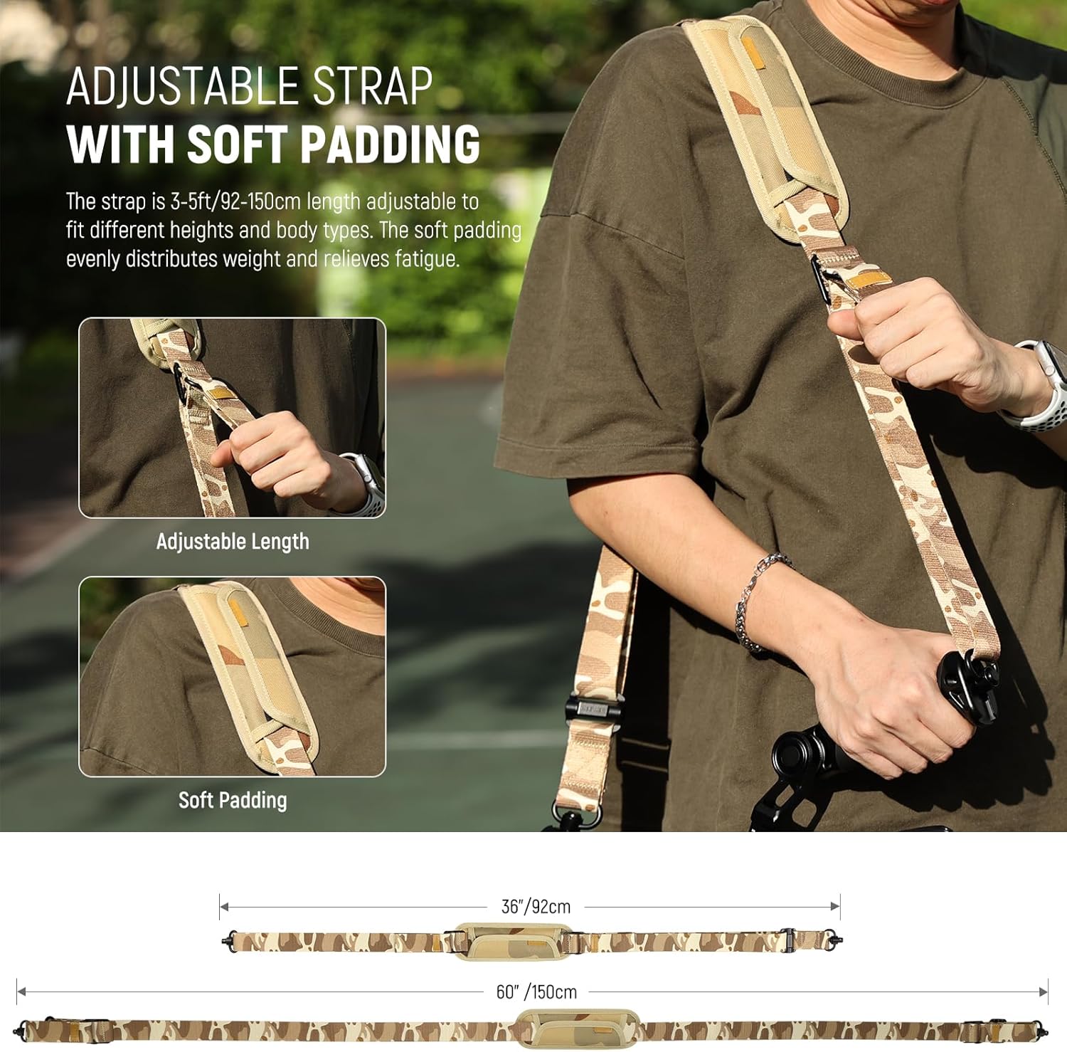 - Sangle ajustable avec rembourrage doux - La sangle mesure de 92 à 150 cm (3 à 5 pieds) et s'adapte à différentes tailles et morphologies. Le rembourrage doux répartit uniformément le poids et réduit la fatigue.