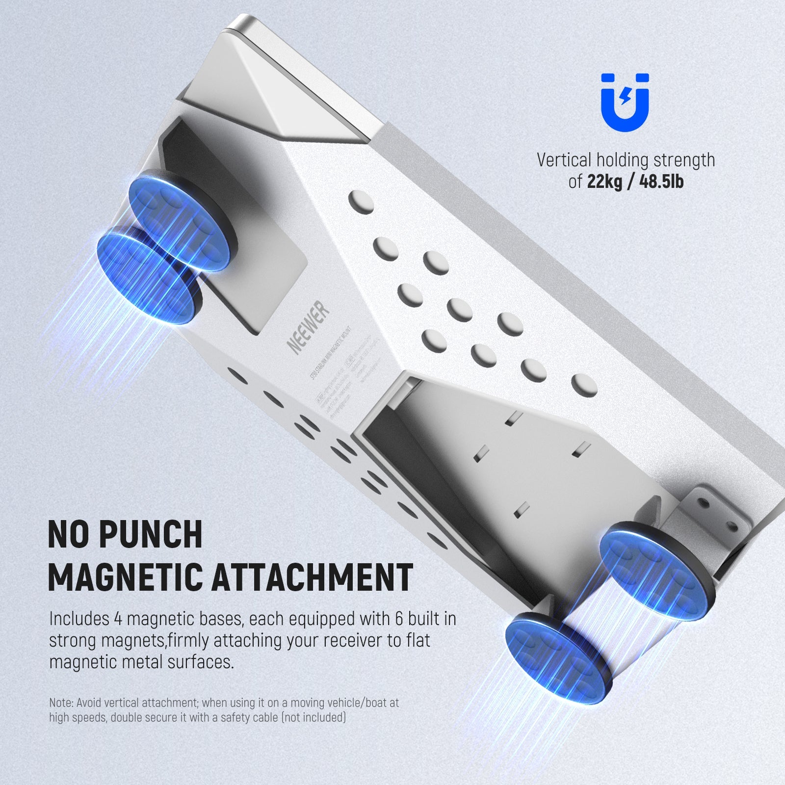 • Fixation magnétique sans perçage : comprend 4 bases magnétiques, chacune équipée de 6 aimants puissants intégrés offrant une force de maintien verticale impressionnante de 22 kg. Elles fixent solidement votre récepteur sur les surfaces métalliques lisses et magnétiques, telles que les toits de véhicules, de bateaux ou de bâtiments en fer. Cette installation efficace et sans perçage n’endommagera jamais vos biens. Remarque : évitez la fixation verticale ; lors d’une utilisation sur un véhicule ou un bateau en mouvement à grande vitesse, doublez la fixation à l’aide d’un câble de sécurité (non fourni).