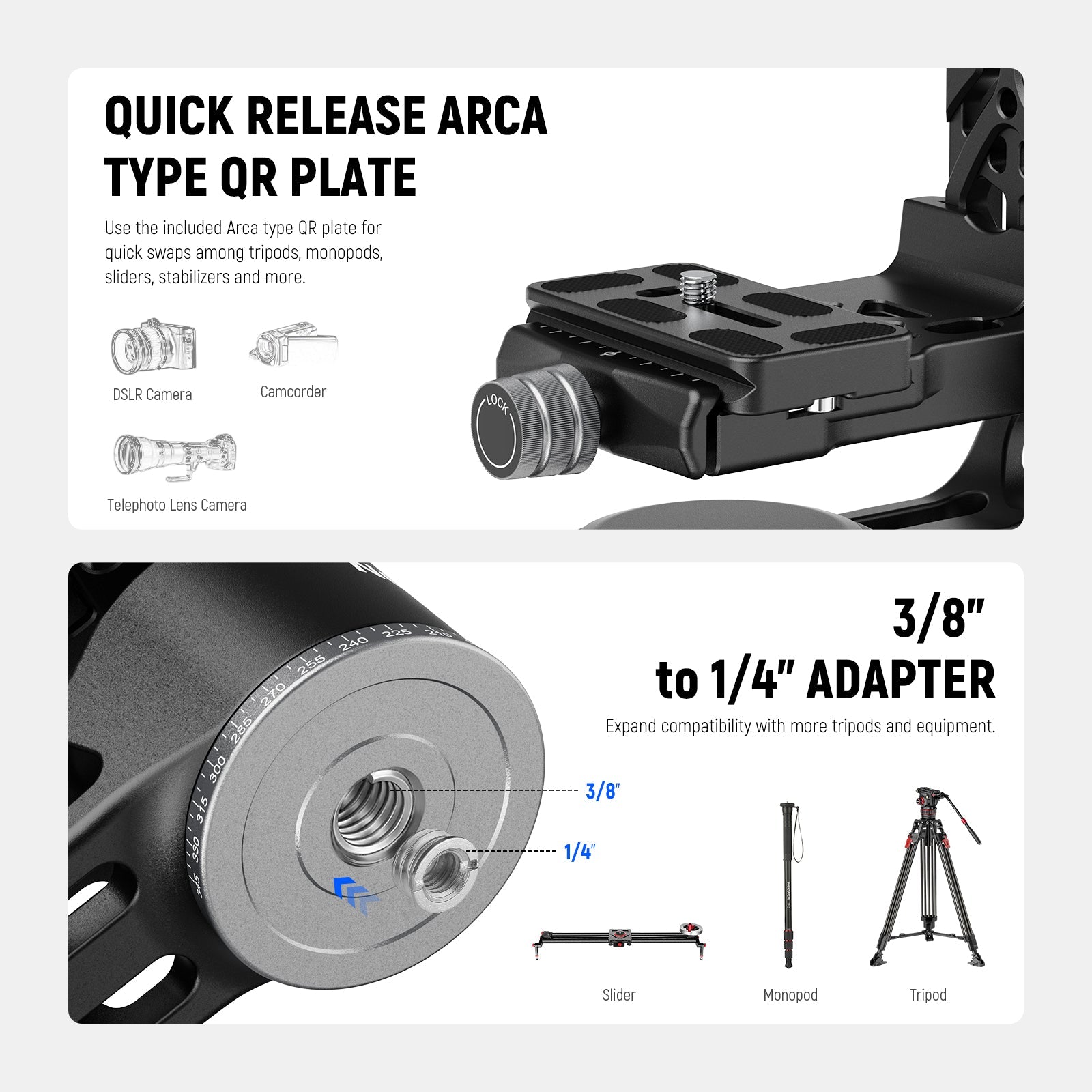 - Plaque de fixation rapide de type Arca : fini les changements d'appareil fastidieux ! Utilisez la plaque de fixation rapide de type Arca incluse pour passer rapidement d'un trépied, d'un monopode, d'un slider, d'un stabilisateur, ou même d'un support de sangle de sac à dos compatible avec un système de fixation identique. La molette latérale assure un verrouillage sûr et précis, pour une sérénité totale lors de vos séances photo.