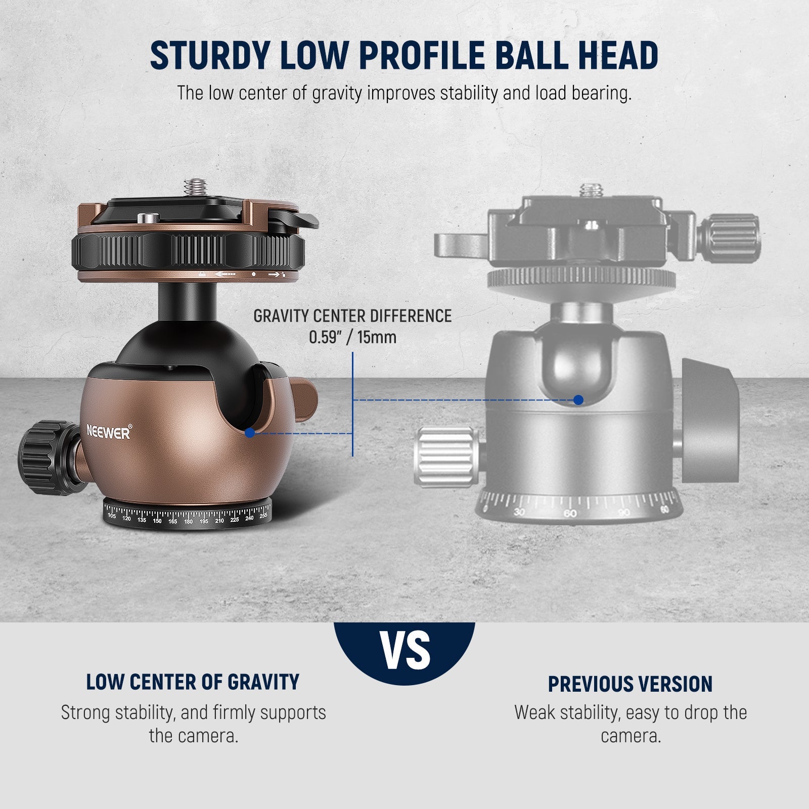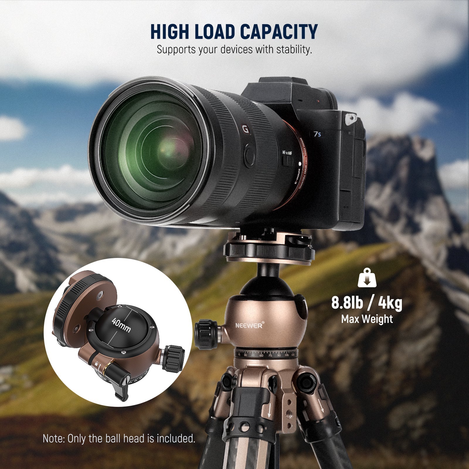 - Rotule à profil bas - Pour des prises de vue stables et sans tremblements, cette rotule métallique de 40 mm de diamètre abaisse son centre de gravité pour une stabilité accrue et supporte une charge jusqu'à 6 kg (13 lb), tout en offrant une plus grande flexibilité pour des angles et des perspectives uniques sur trépieds.