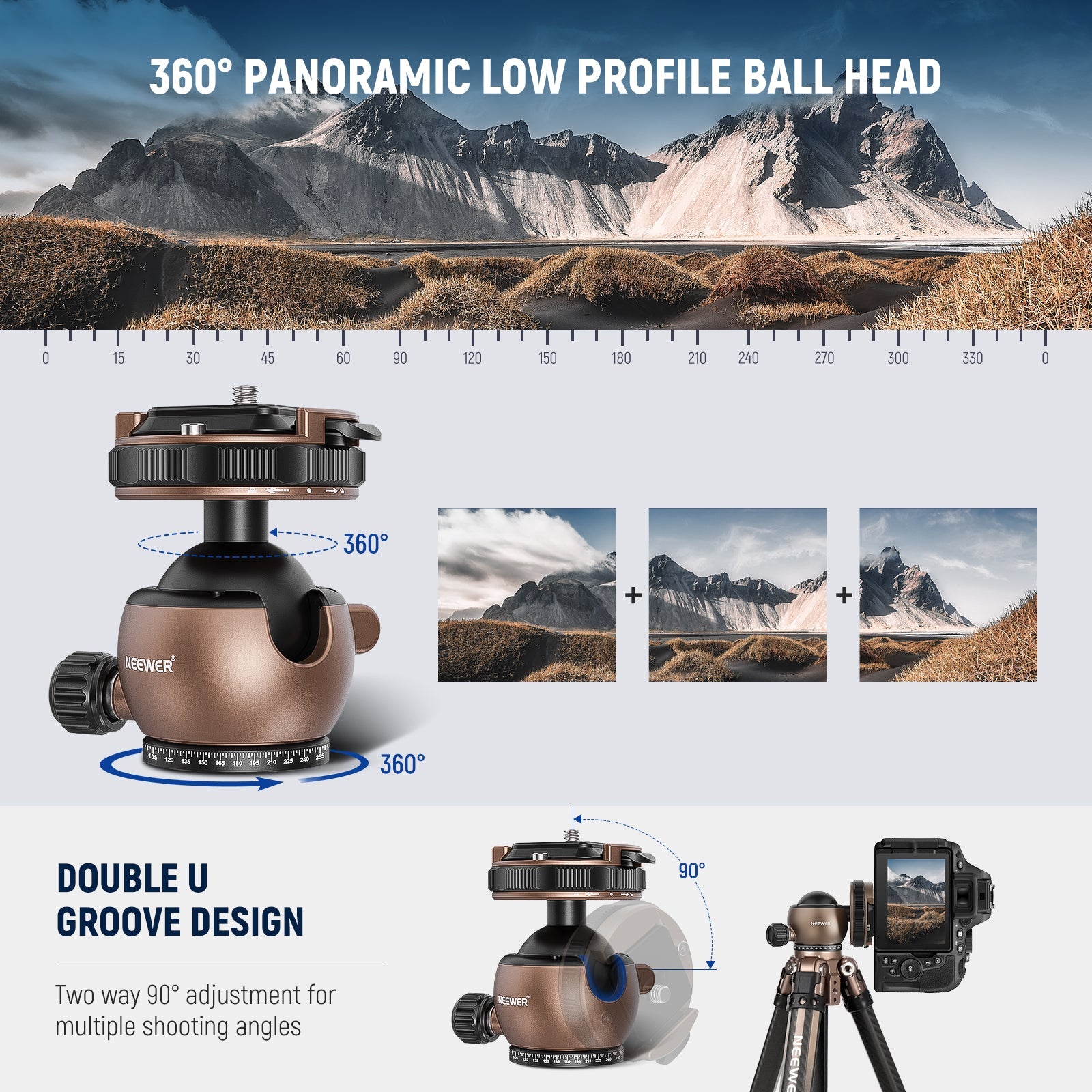 - Rotation à 360° et inclinaison à 90° : la rotule à encoche en U assure une prise de vue panoramique à 360° et une inclinaison verticale à 90° de manière flexible et stable, avec un verrouillage rapide pour passer facilement du mode portrait au mode paysage. Des graduations précises sur la rotule et une molette de verrouillage permettent des mouvements horizontaux plus précis et fluides.