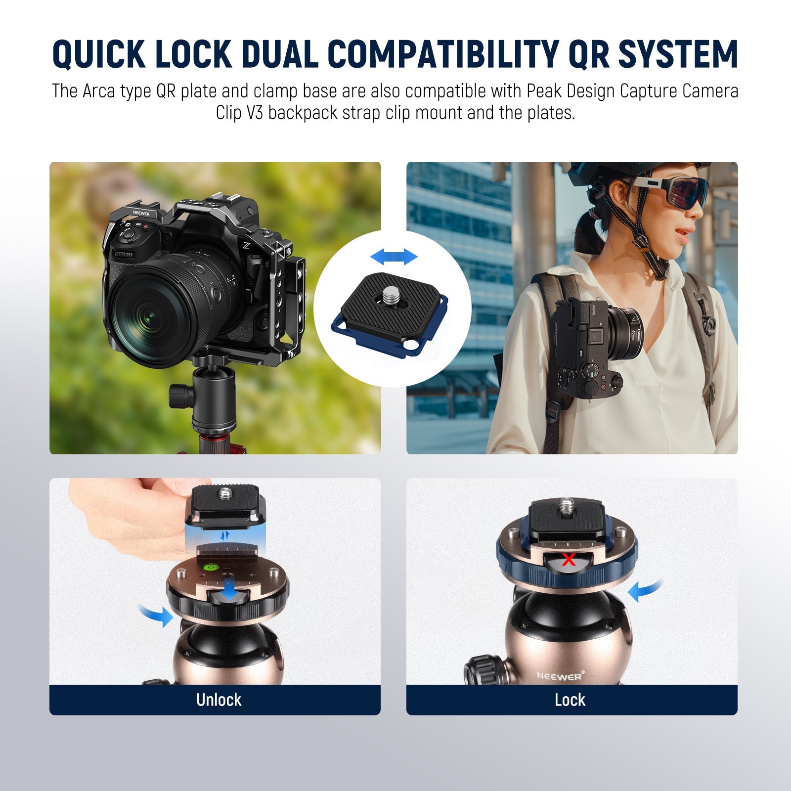 - Plusieurs points de fixation : la vis supérieure 1/4" de la plaque de fixation rapide est compatible avec les appareils photo hybrides, les compacts, les reflex numériques de petite taille, etc. Le filetage inférieur 3/8" permet la fixation sur un trépied, un monopode, un slider, etc. Le filetage 1/4" de la pince de fixation rapide facilite l'installation de lampes LED, de moniteurs et de bras articulés pour une création de contenu polyvalente.