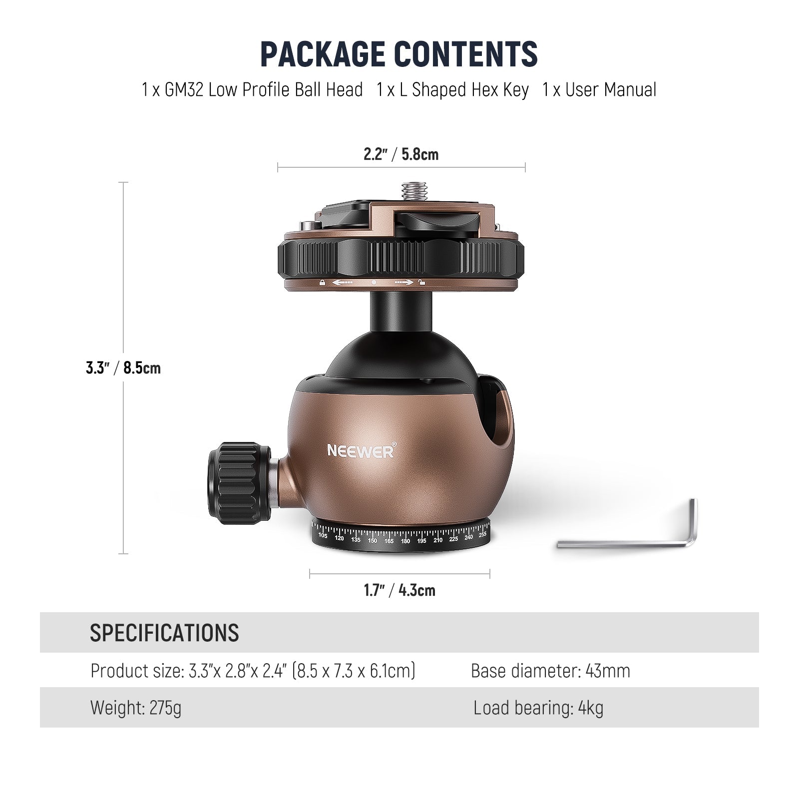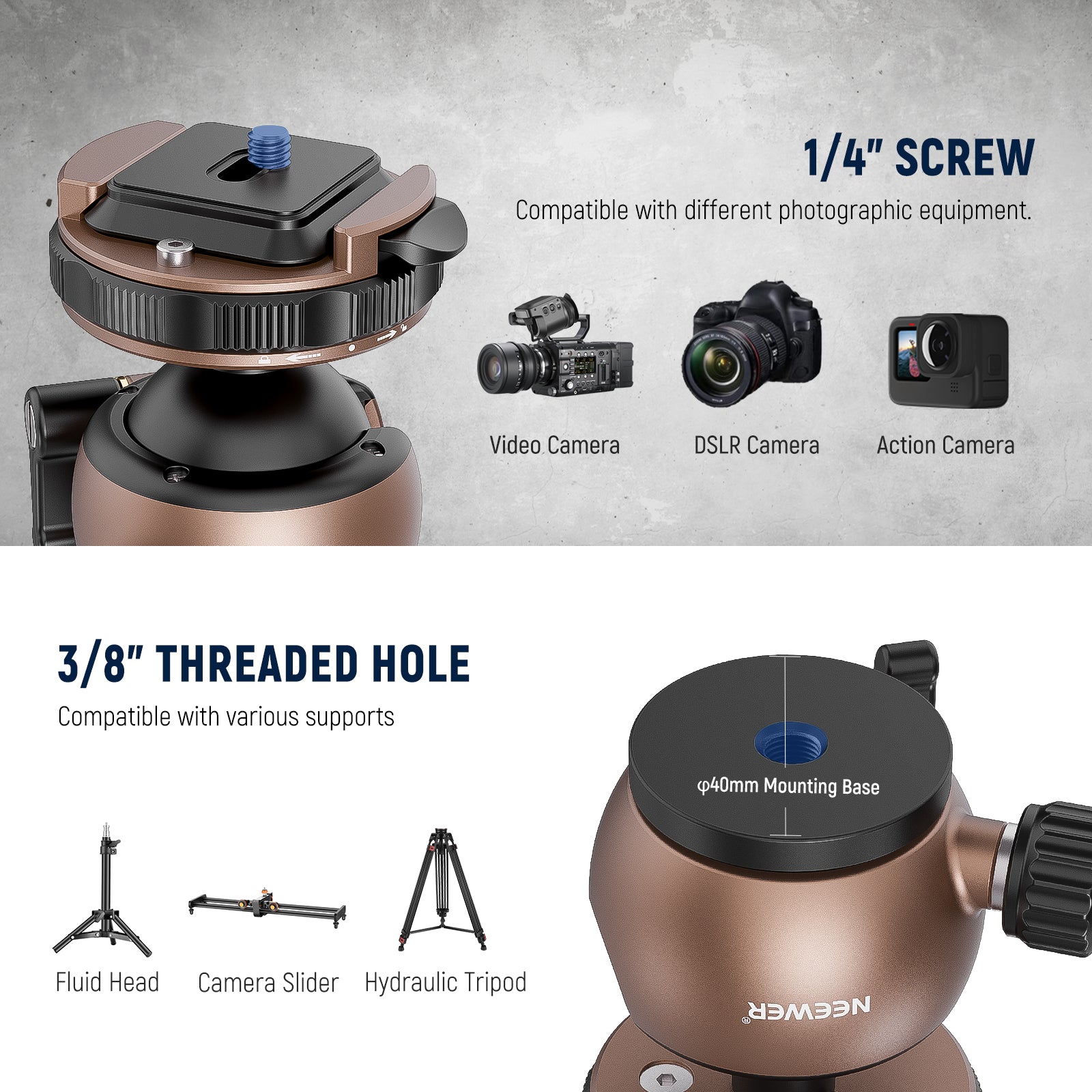 - Durable et portable – Conçue en alliage d'aluminium usiné CNC de haute qualité, la rotule de trépied garantit durabilité et haute performance en toutes circonstances. Mesurant 86 x 73 x 61 mm et ne pesant que 275 g, elle se glisse facilement dans une poche et vous accompagne partout, idéale pour les prises de vue en extérieur ou les tournages en déplacement.