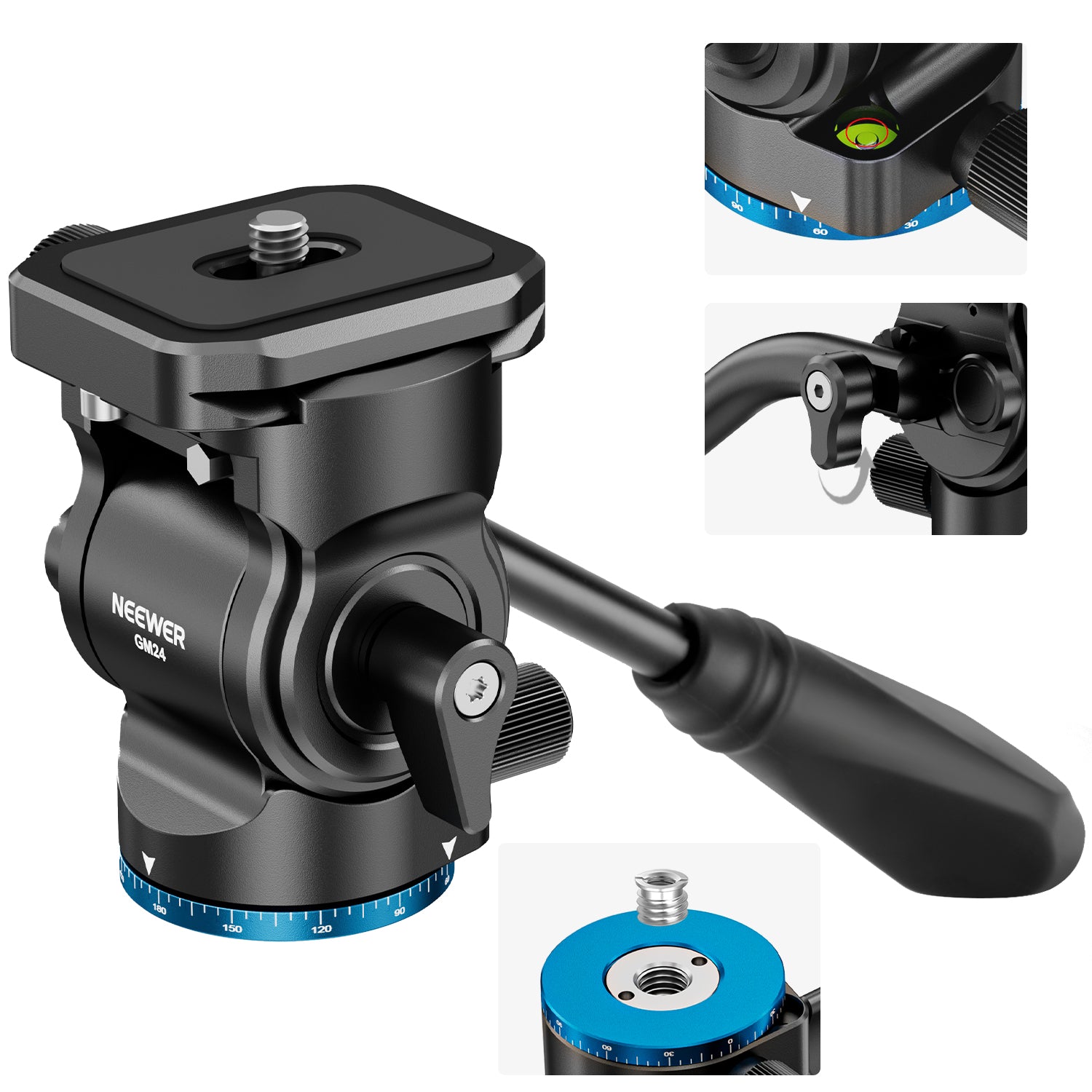 - Cette tête fluide compacte assure des mouvements fluides et un amortissement par friction fixe. Elle supporte une rotation à 360° et une inclinaison de -55° à 90°.