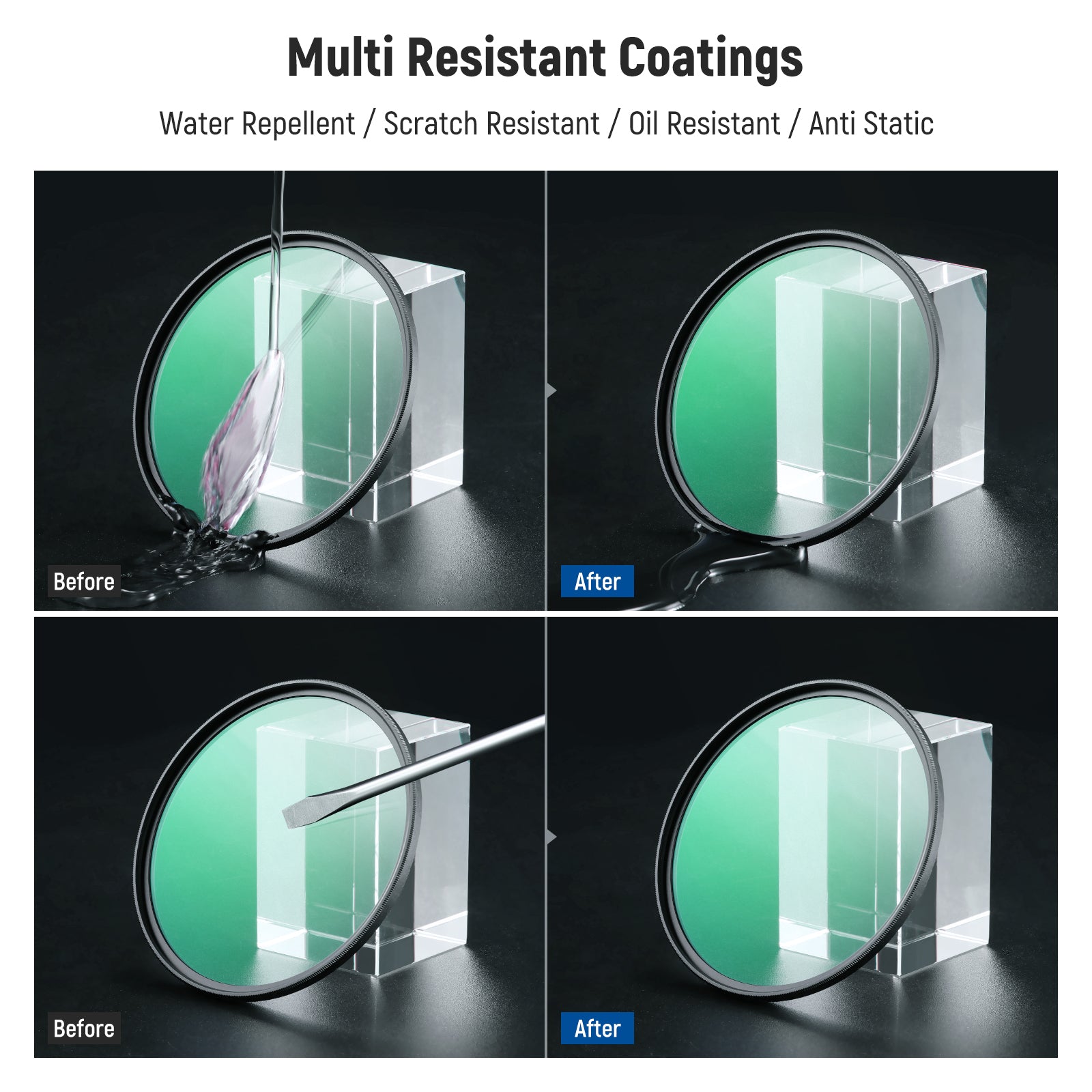 - Revêtements nano multiples - Les revêtements nano multiples présents sur les deux faces sont hydrofuges, résistants aux rayures et oléophobes, réduisant efficacement la réflexion provenant du filtre lui-même et du sol.