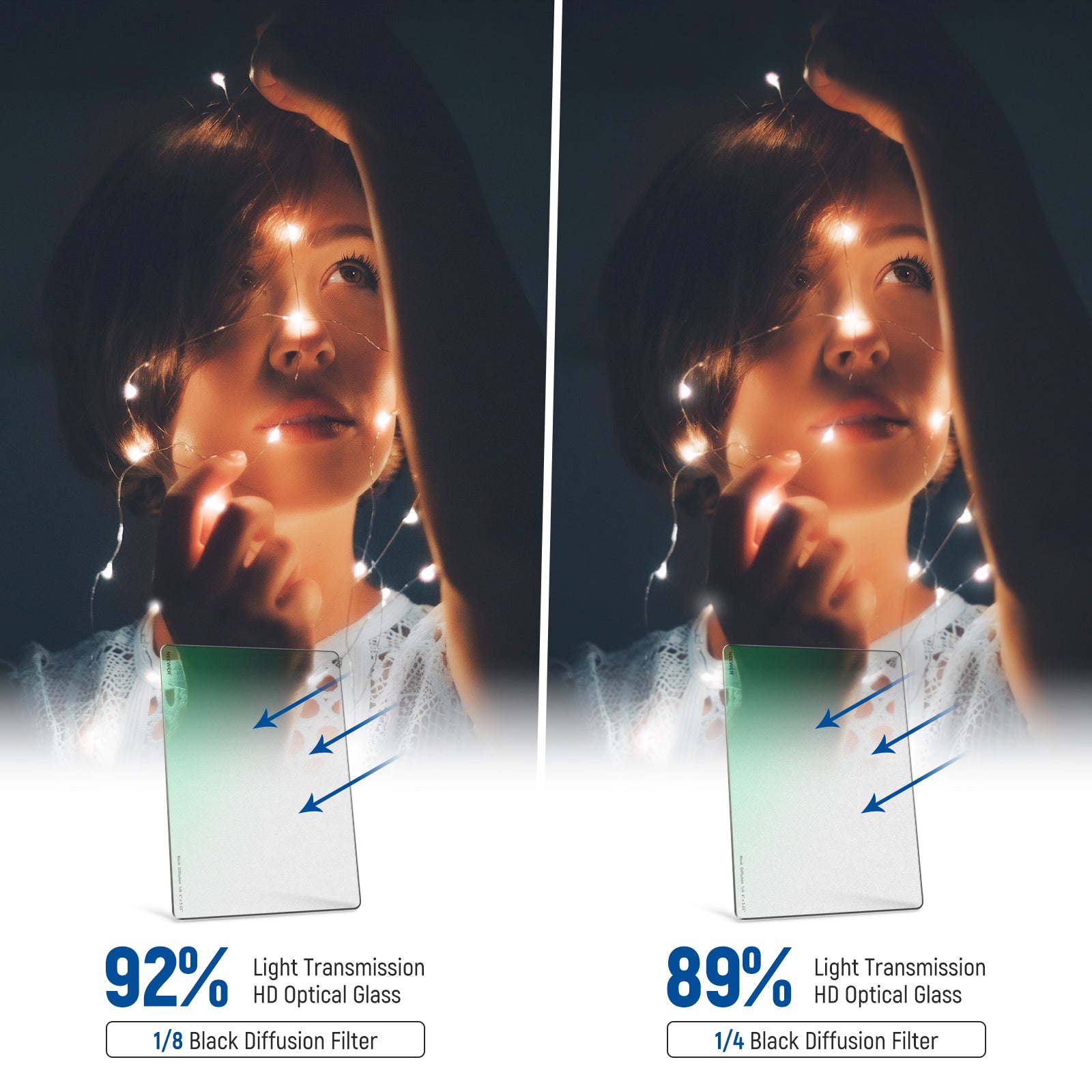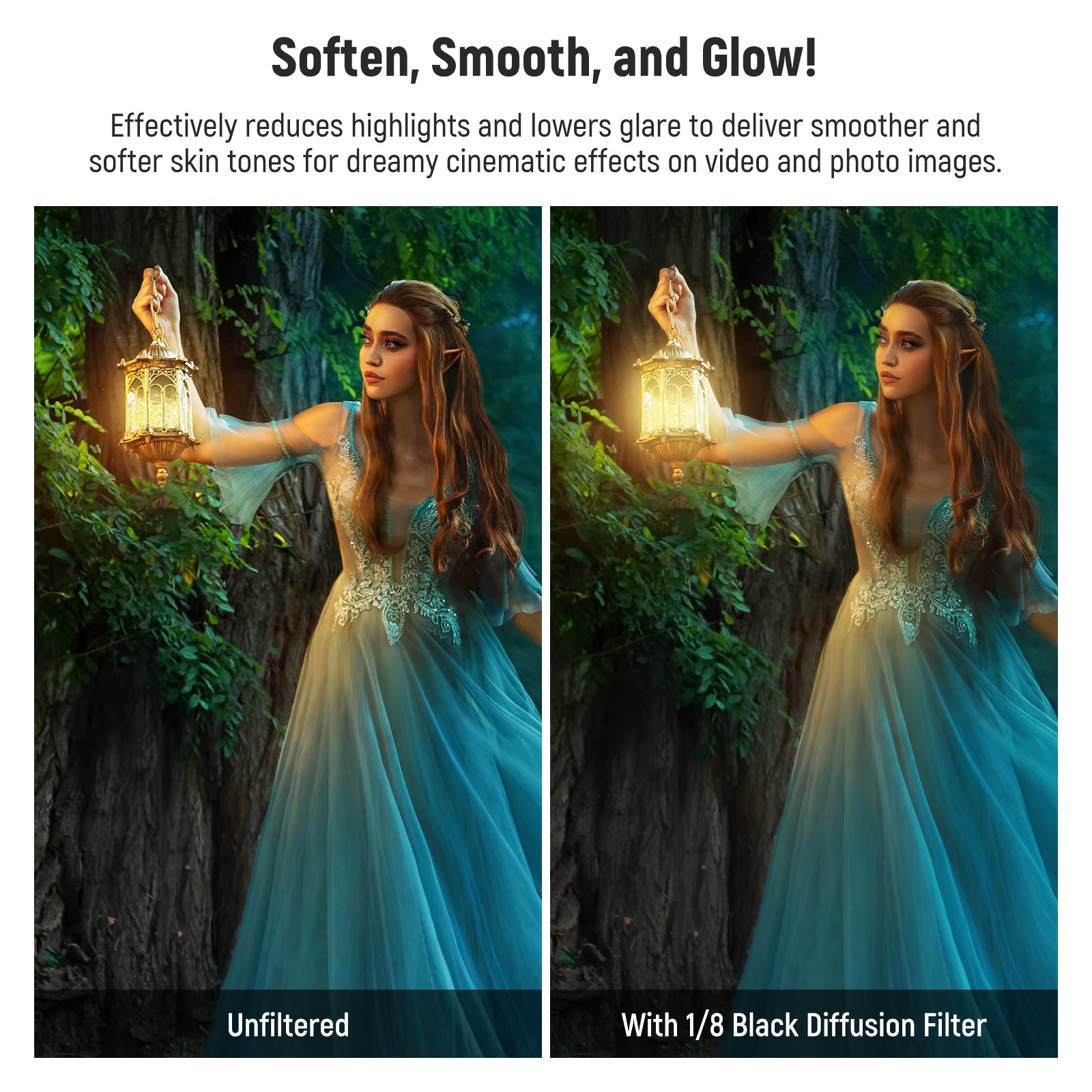 - Filtre de diffusion noir 1/8 pour un effet cinématographique - Ce filtre de diffusion noir 1/8 réduit efficacement les hautes lumières et les reflets pour un teint plus doux et lisse, idéal pour des photos et vidéos au rendu cinématographique. Parfait pour la photographie de portrait, l'enregistrement vidéo et le vlogging.