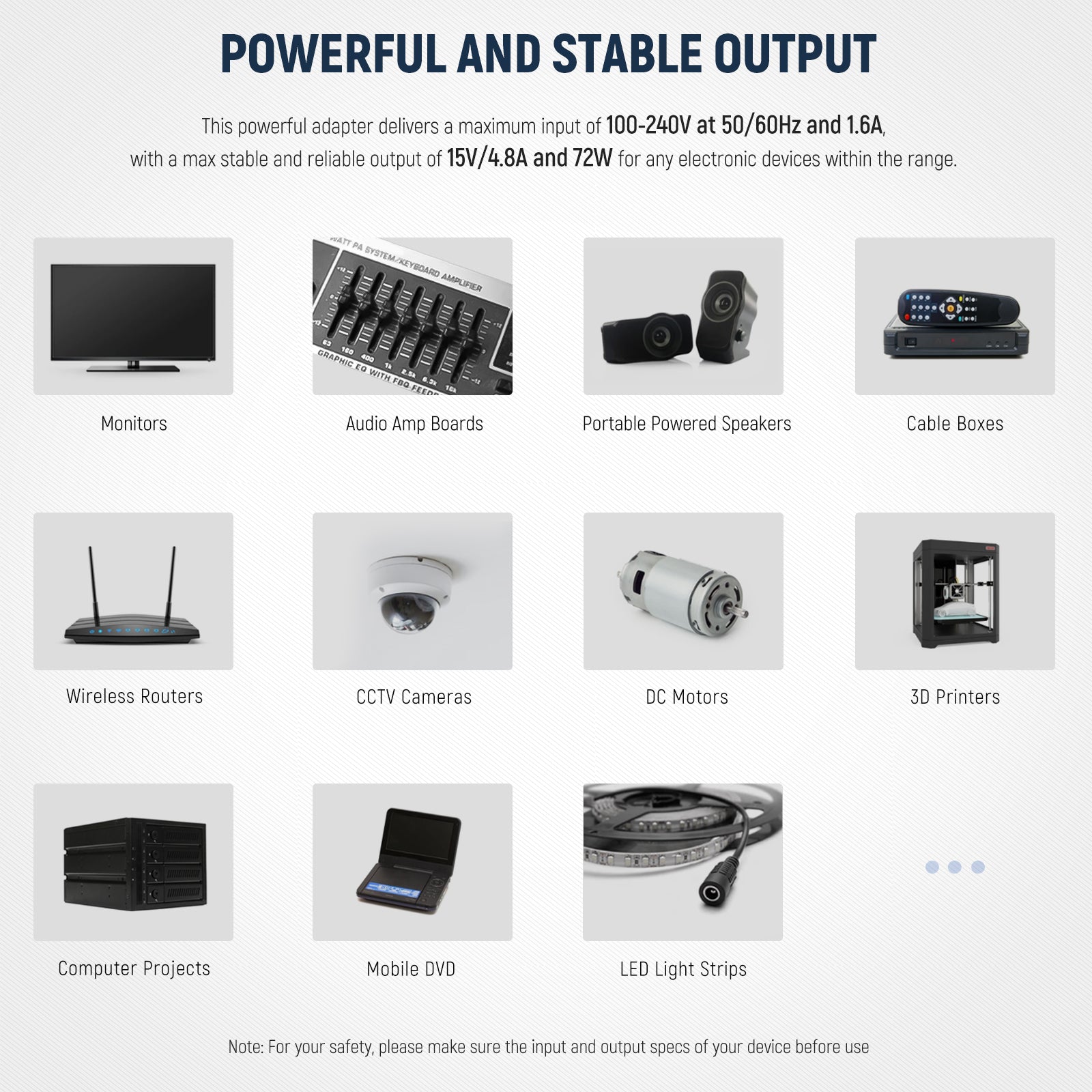 - Sortie 15 V/4,8 A 72 W - Cet adaptateur et son câble puissants fournissent une tension d'entrée maximale de 100 à 240 V à 50/60 Hz et 1,6 A, avec une sortie stable et fiable de 15 V/4,8 A et 72 W pour tous les appareils électroniques compatibles. Remarque : Pour votre sécurité, veuillez vérifier les spécifications d'entrée et de sortie de votre appareil avant utilisation.