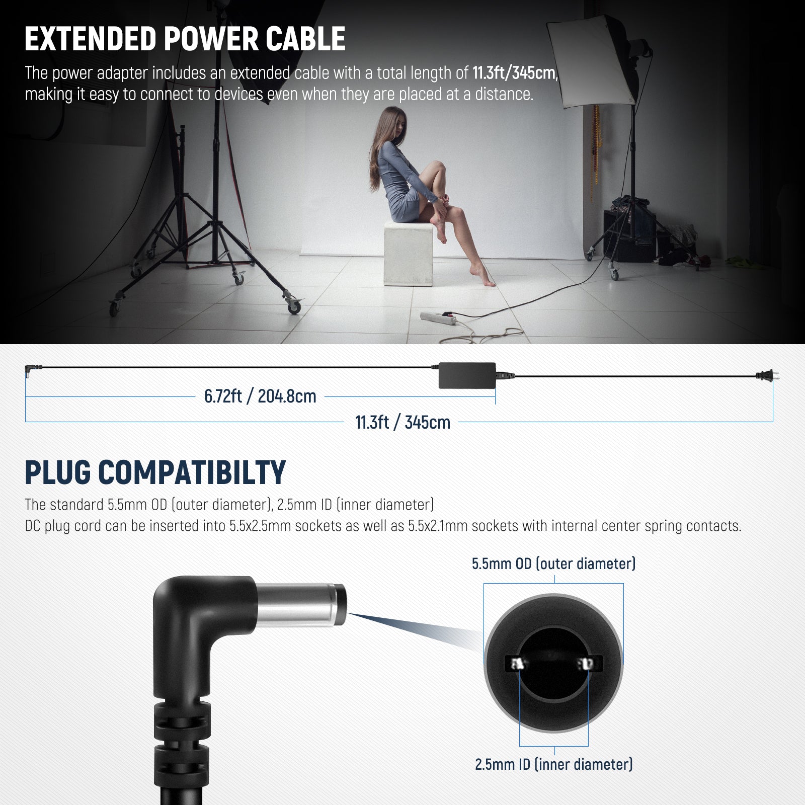 - Compatibilité étendue avec les câbles et prises : l’adaptateur secteur et le câble d’alimentation offrent une longueur totale de 345 cm (11,3 pi), facilitant ainsi la connexion aux appareils, même éloignés. De plus, la prise CC standard de 5,5 mm de diamètre extérieur et 2,5 mm de diamètre intérieur est compatible avec les prises 5,5 x 2,5 mm et 5,5 x 2,1 mm dotées de contacts centraux à ressort.