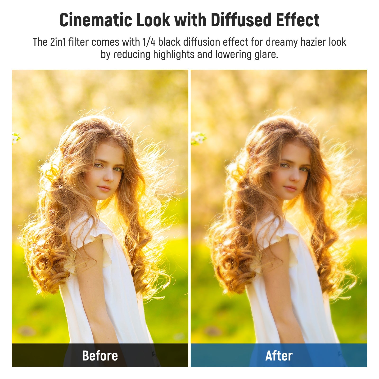 - Effet cinématographique avec diffusion noire 1/4 - Ce filtre inclut également un effet de diffusion noire 1/4 pour un rendu plus vaporeux et onirique, en atténuant les hautes lumières et les reflets. Il contribue à lisser le teint en photographie de portrait.