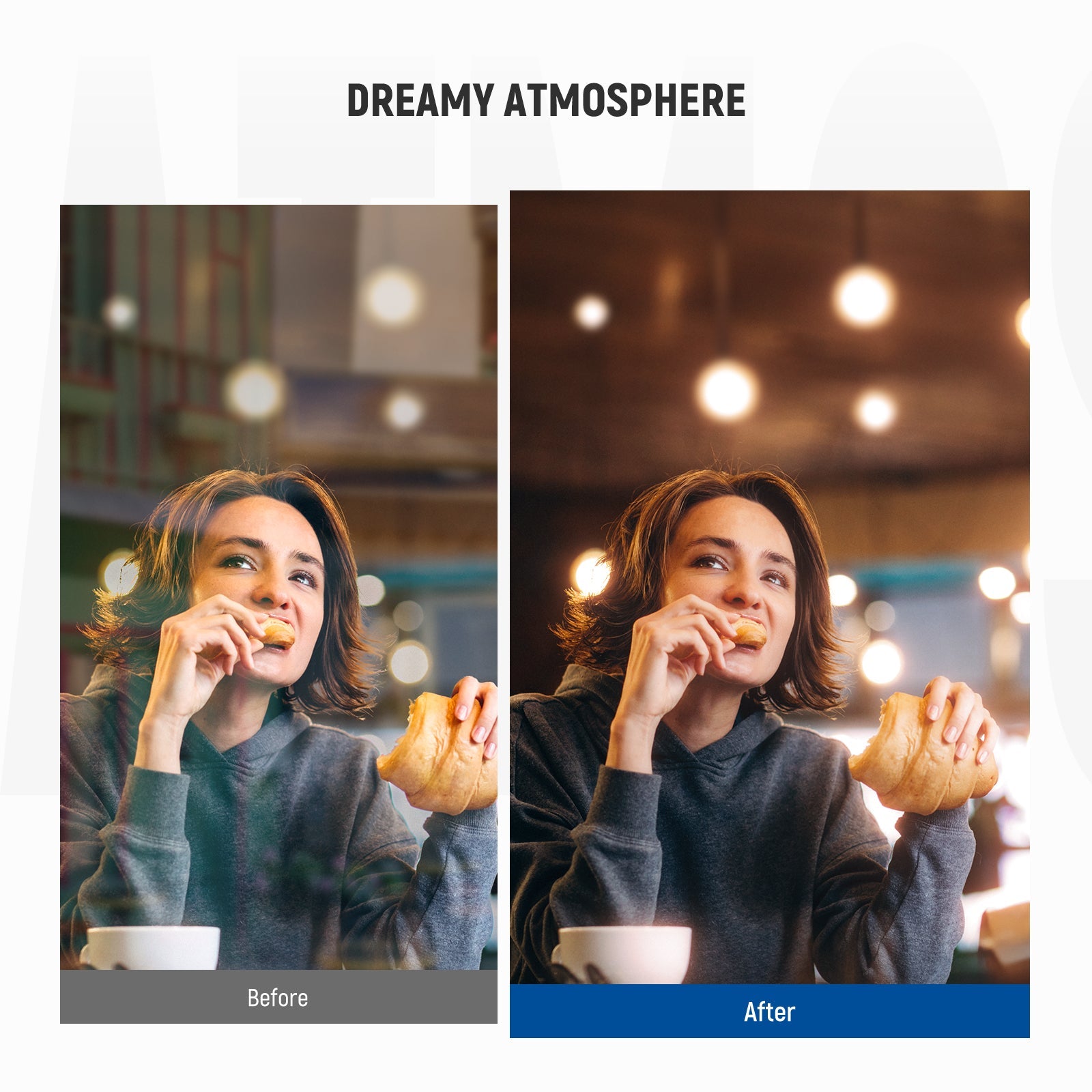 - Effet doux et onirique cinématographique - Lissez le grain de peau tout en ajoutant un effet onirique et cinématographique à vos photos, parfait pour les portraits, les selfies et les vlogs personnels.