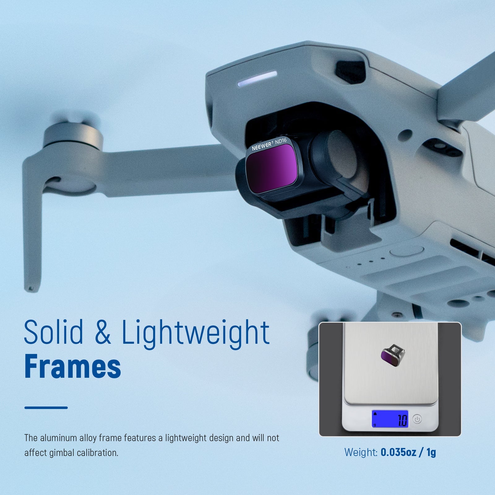 - Installation légère et rapide : chaque filtre ne pèse que 0,76 à 0,8 g et n’affecte pas la nacelle de votre drone. Le cadre en alliage d’aluminium, doté d’une surface antidérapante, facilite l’installation et le retrait du filtre. Il épouse parfaitement la lentille et ne se desserre pas facilement, sans altérer la qualité d’image. (Remarque : il est incertain que cette dernière pièce doive être laissée en place ou retirée.)
