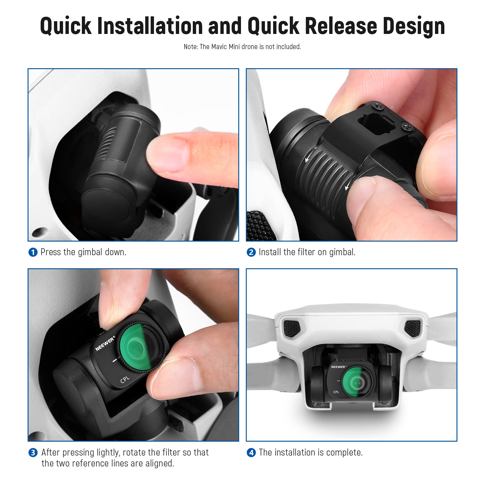 - Compatible avec les Mavic Mini/Mini 2/Mini SE, le kit de 3 filtres NEEWER (ND8 + ND16 + CPL) est spécialement conçu pour les caméras DJI Mavic Mini/Mavic Mini 2/Mini SE. Emportez-le partout avec vous grâce à son étui de transport pratique. Le kit comprend également 3 filtres et un chiffon de nettoyage.