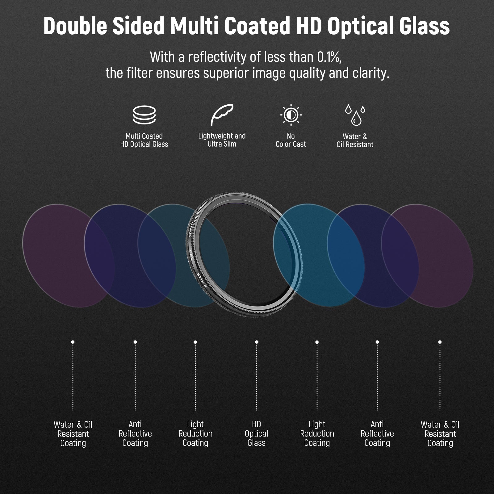 - Verre optique HD multicouche - Fabriqué en verre optique HD importé, ce filtre doté de 30 couches de revêtements multicouches résistants sur les deux faces offre une protection efficace contre l'eau, la poussière, l'huile, les traces de doigts et les rayures. De plus, il est très facile à nettoyer.