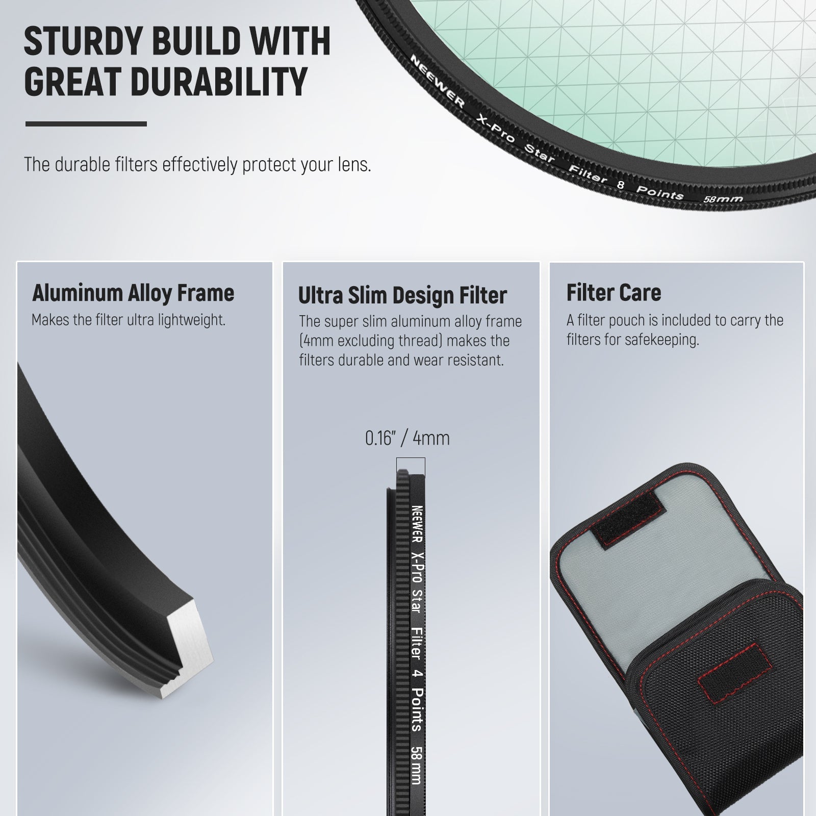 - Conception professionnelle en verre optique : fabriqués en verre optique aux lignes soigneusement travaillées, les filtres à 4, 6 et 8 branches créent de magnifiques effets d'étoiles croisées sur l'écran sans compromettre la qualité d'image. Le cadre ultra-fin en alliage d'aluminium (4 mm hors filetage) confère aux filtres une grande durabilité et une excellente résistance à l'usure. Le bord moleté assure une prise en main ferme, tandis que le revêtement nano double face les rend hydrofuges, oléophobes, résistants aux rayures et durables.