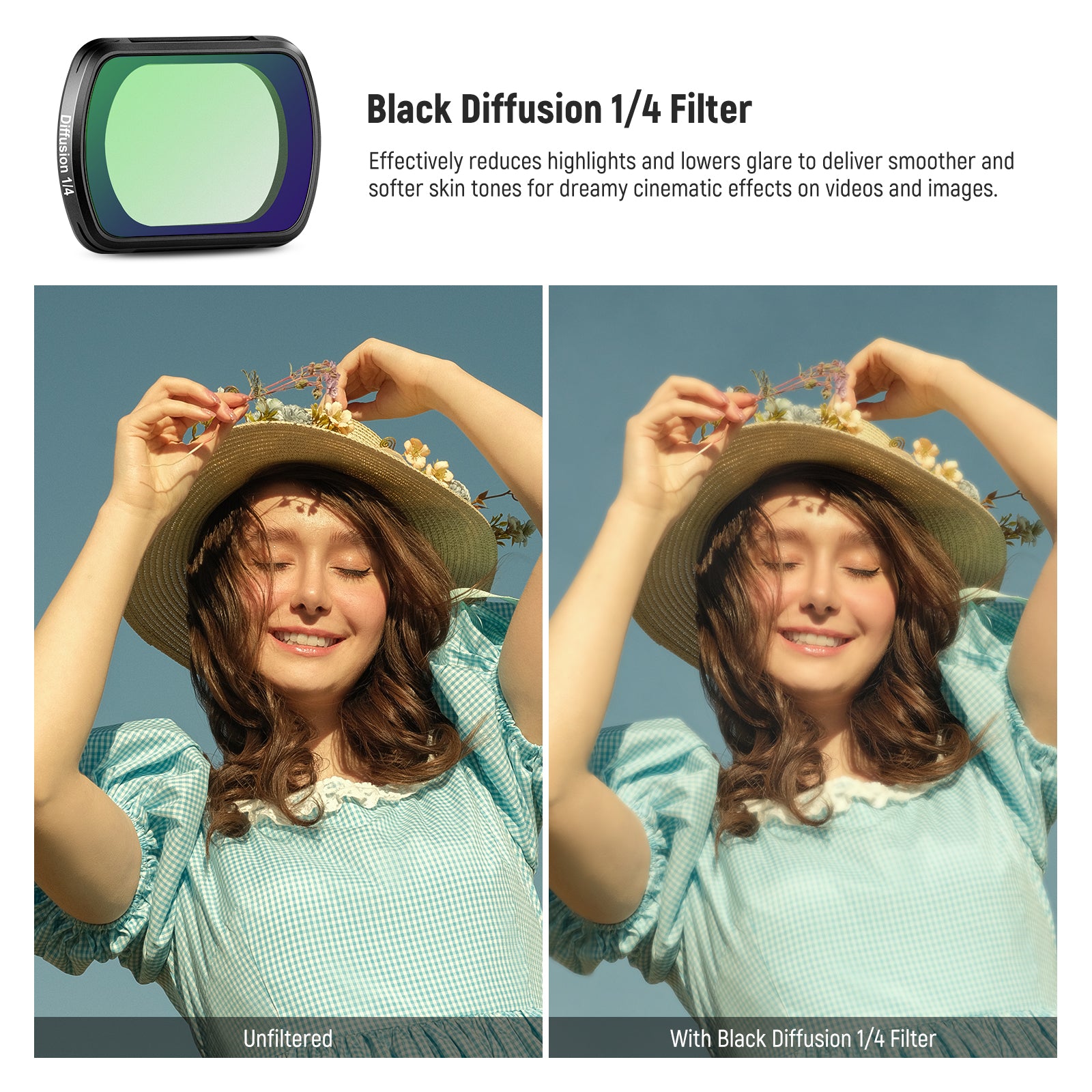 - Ambiance cinématographique onirique et superbes images nocturnes : le filtre de diffusion noir 1/4 à effet cinématographique onirique atténue les hautes lumières et réduit l’éblouissement pour un rendu plus flou et doux, idéal pour les portraits, les vidéos et les vlogs. Ce filtre anti-pollution lumineuse réduit la dominante jaune-verte due aux lumières de la ville, capture les détails de votre sujet, préserve les contrastes et évite la surexposition.