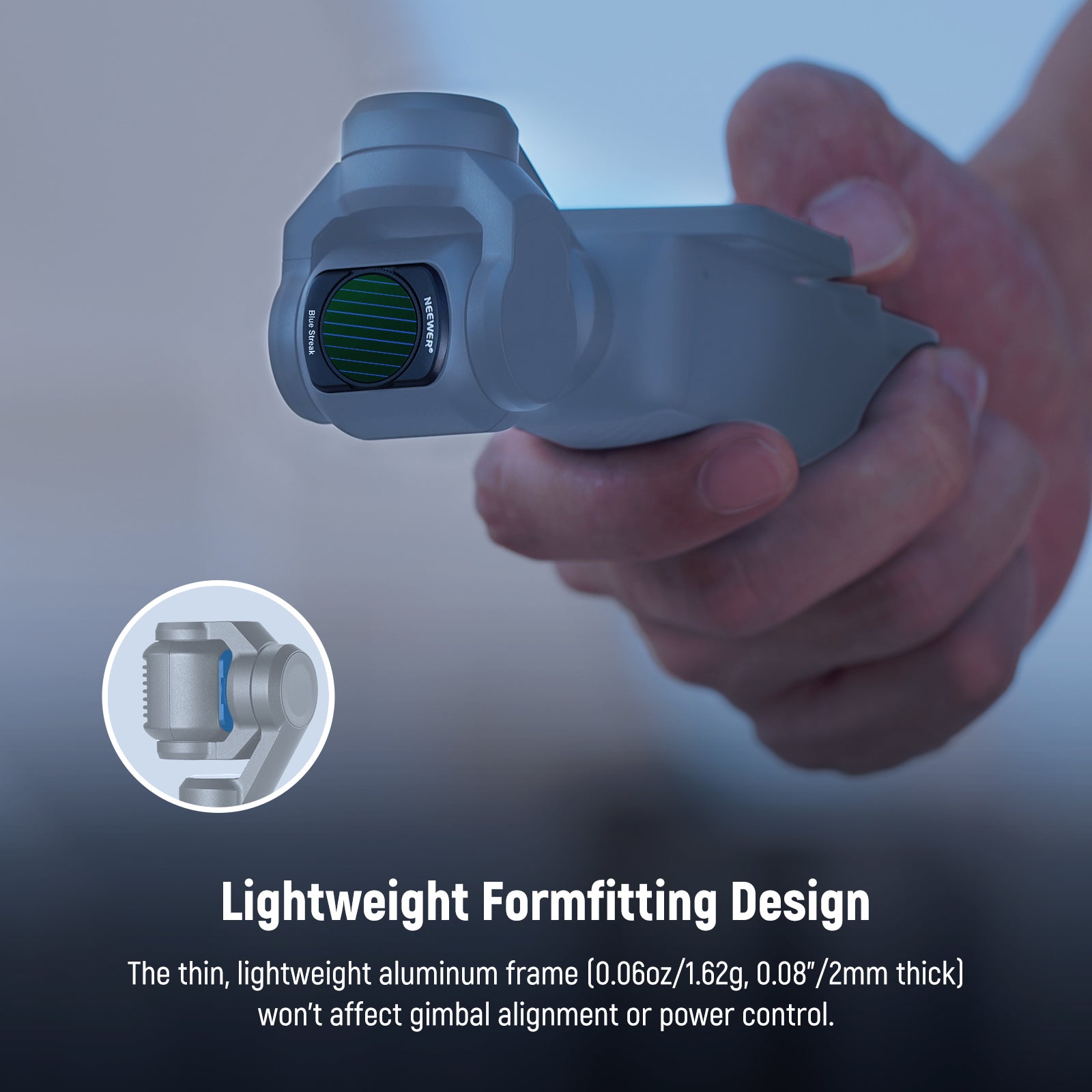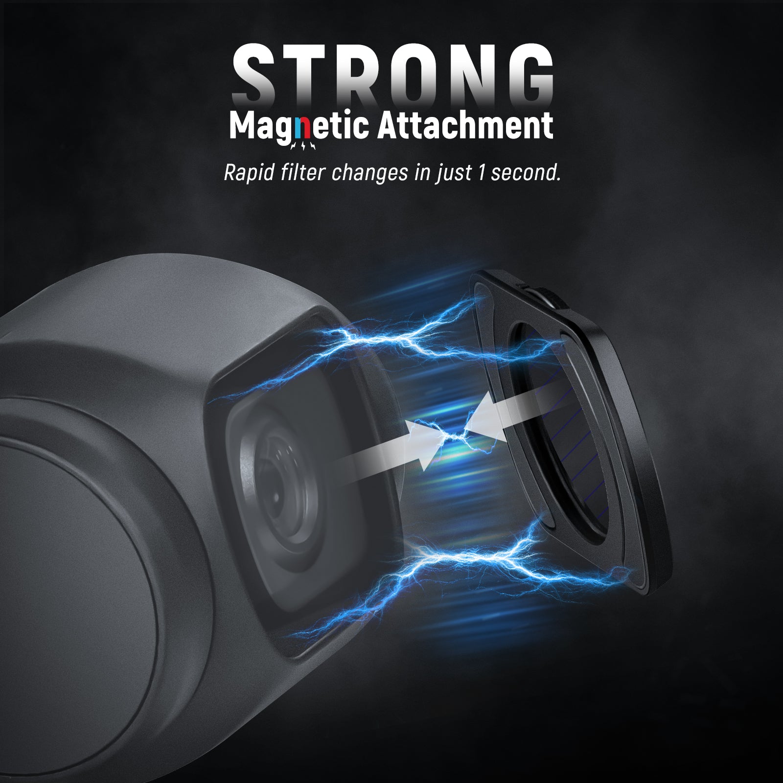 - Fixation magnétique rapide et sécurisée : grâce à sa conception magnétique, le changement de filtre se fait en une seconde et assure une fixation sûre lors de l’utilisation du suivi automatique, de la prise de vue de sports en extérieur ou du passage du mode horizontal au mode vertical. Le cadre en aluminium léger usiné CNC avec précision (1,62 g) s’adapte parfaitement au stabilisateur sans incidence sur son étalonnage ni son rangement.