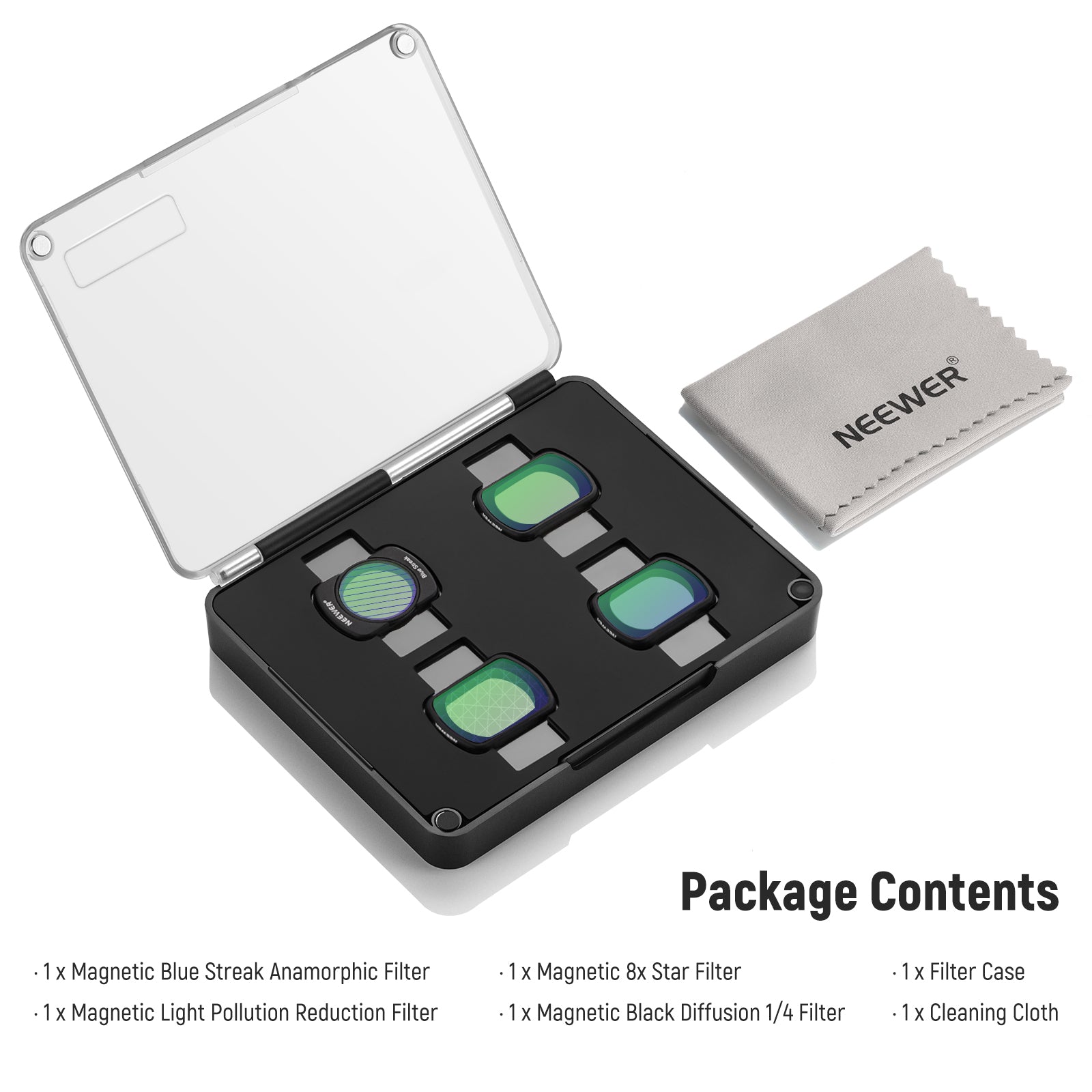 - Effets anamorphiques et étoiles scintillantes : le filtre à effet de traînée bleue ajoute une subtile traînée bleue à votre image pour un rendu cinématographique. Le filtre étoile 8x diffracte la lumière pour créer des étincelles à 8 points à partir de points lumineux, ajoutant une touche de flare spéciale qui renforce l’atmosphère onirique de vos images. Ils sont idéaux pour photographier les lampadaires, les scènes nocturnes, les bijoux, les voitures et les objets en verre.