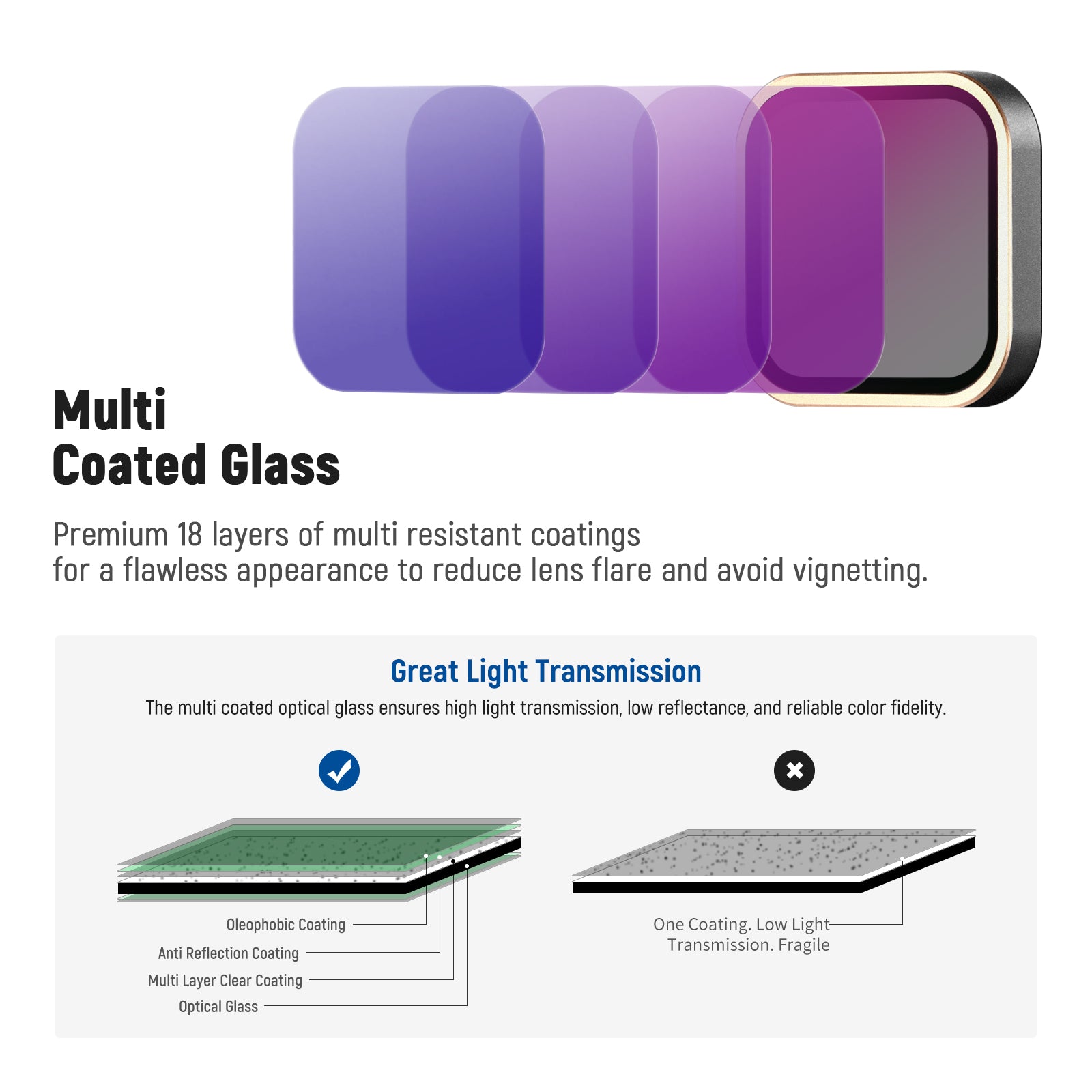 - VERRE OPTIQUE HD MULTICOUCHES - Fabriqué en verre optique HD, ce verre offre une excellente transmittance et une clarté cristalline pour une vidéo haute définition. Résistant à l'eau, à l'huile et aux rayures, il réduit également la formation de buée due aux traces de doigts. Il garantit un faible indice de réfraction, une neutralité des couleurs exceptionnelle et une transmission optimale de la lumière.