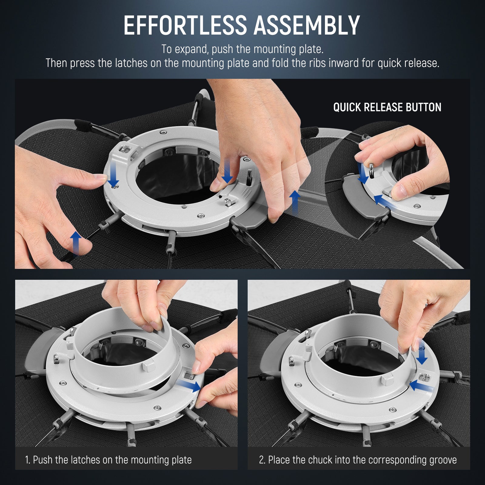 - Montage facile : une simple pression sur la plaque de montage suffit pour déplier et verrouiller la boîte à lumière sans effort. Les fixations à boucle et crochet permettent de fixer les diffuseurs et la grille inclus. Elle est alors prête à l’emploi. Pour la ranger, il suffit de pousser les loquets de la plaque de montage et de replier les baleines vers l’intérieur pour un démontage rapide. Ses 8 baleines robustes et résistantes lui confèrent une durabilité incomparable : elle peut supporter des dizaines de milliers de déclenchements sans se déformer, pour une utilisation durable.