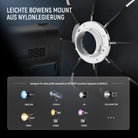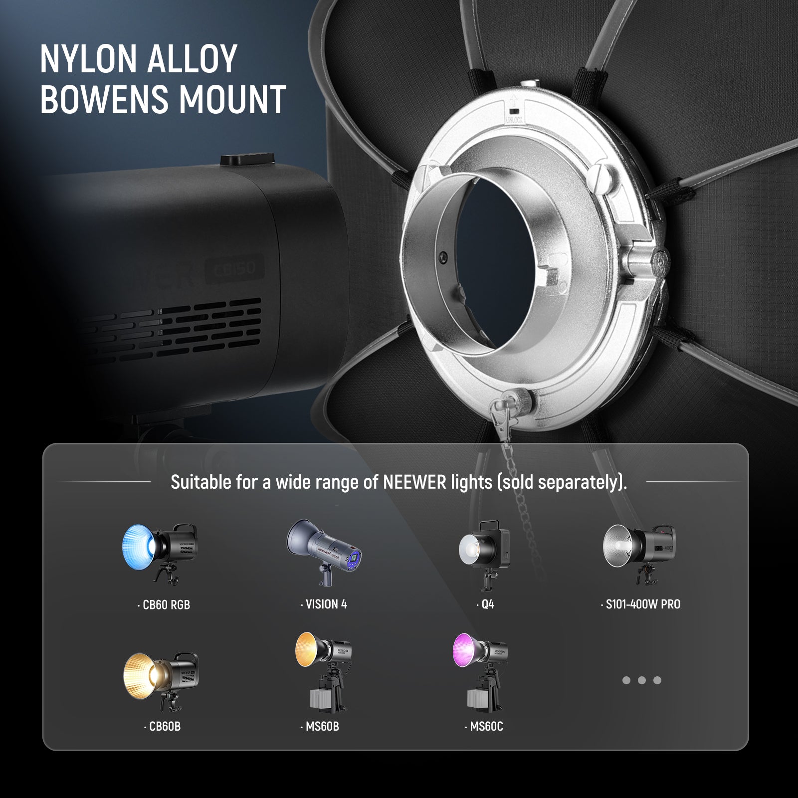 - Fixation via monture Bowens - Grâce à sa monture Bowens, la softbox est compatible avec les flashs Aputure 120D, Godox SL60w, SmallRig RC 120D et RC 120B, ainsi qu'avec les flashs NEEWER Q4, AS600B, CB300B, CB300C, CB200, CB200B, CB60, CB60B, S101-300W PRO, S101-400W PRO, S102-400W PRO, Vision 4 et Q300, et autres éclairages vidéo LED continus équipés d'une monture Bowens.