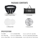 - Grille nid d'abeille et diffuseurs - Le kit d'éclairage softbox comprend des diffuseurs internes et externes, combinables pour une lumière encore plus douce et diffuse. La grille nid d'abeille dirige la lumière à 45° et réduit la diffusion, offrant un éclairage à la fois doux et percutant qui met en valeur les traits du visage du modèle.