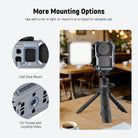 - Options de montage multiples : le boîtier de l’Osmo Action 6 est doté de découpes latérales permettant de passer du mode paysage au mode portrait, d’une griffe porte-accessoires et d’un port à vis 1/4" pour microphones ou éclairages, ou peut être monté sur trépieds ou perches à selfie pour une utilisation polyvalente.