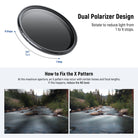 - Réduction de lumière flexible - Ce filtre ND2-400 variable réduit la lumière de 1 à 9 diaphragmes. Il permet d'éviter la surexposition dans diverses conditions météorologiques et de capturer des effets de flou de mouvement grâce à des vitesses d'obturation lentes et de grandes ouvertures. Un simple mouvement de rotation du cadre permet un contrôle précis de l'exposition.