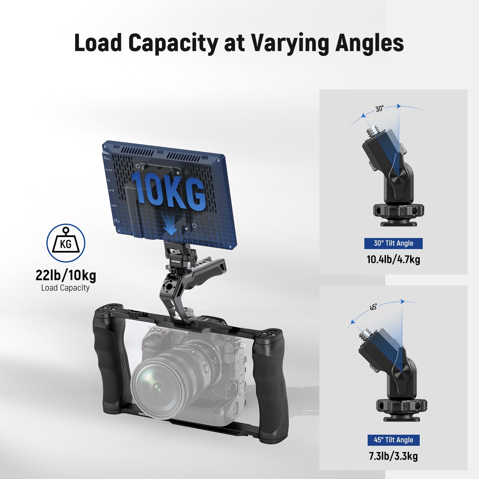 - Solide et léger – La cage pour caméra (poids : 650 g, charge maximale : 15 kg), la poignée supérieure (poids : 145 g, charge maximale : 10 kg) et le support pour moniteur (poids : 55 g, charge maximale : 4,7 kg à 30° ; 3,3 kg à 45°) sont fabriqués en alliage d’aluminium anodisé noir, à la fois léger et robuste. Ce support stabilisateur professionnel est idéal pour l’enregistrement vidéo, le tournage, les vlogs YouTube/TikTok et la réalisation de films en intérieur comme en extérieur. Un accessoire indispensable pour les créateurs de contenu et les influenceurs vidéo.