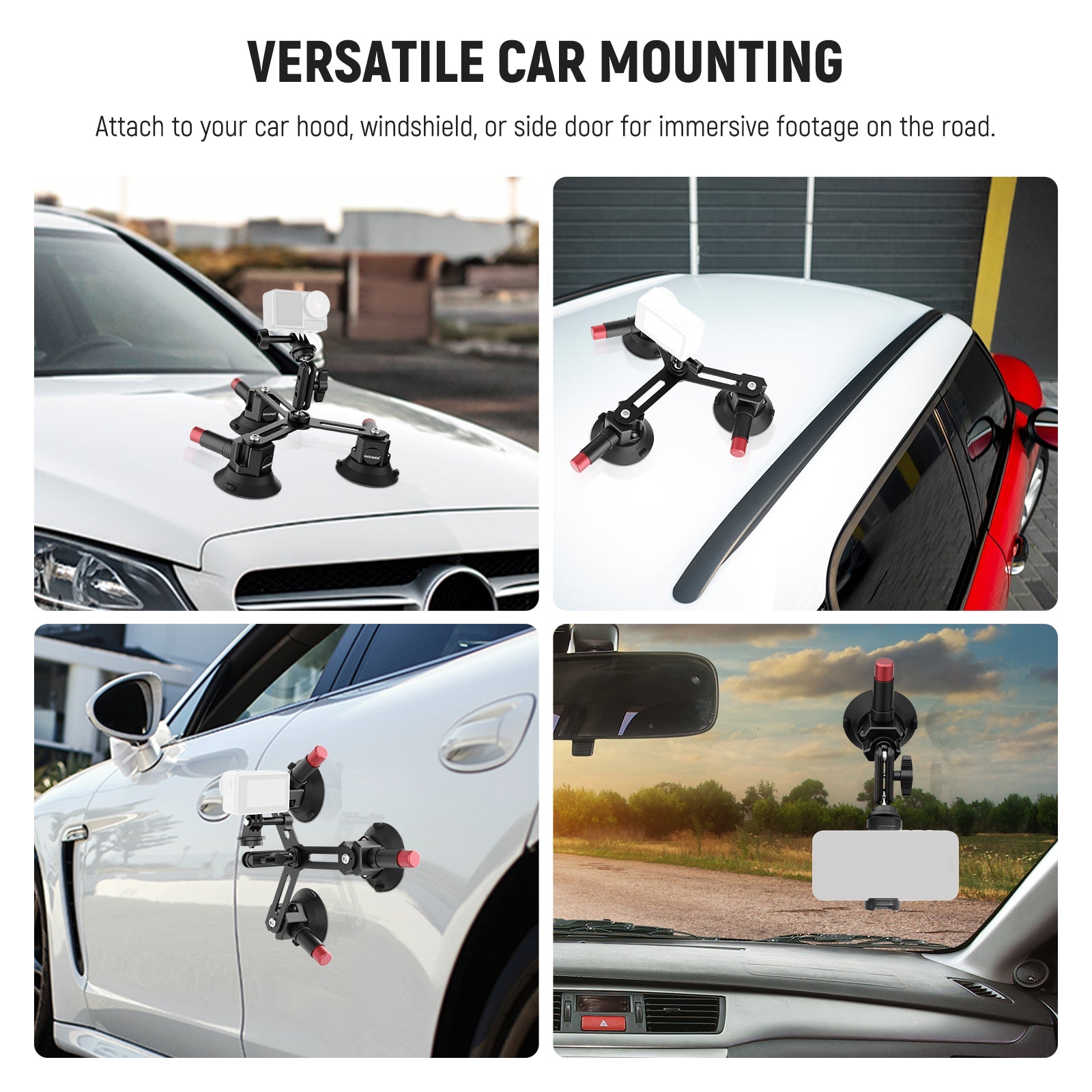 - Kit de fixation pour voiture à triple ventouse - Capturez des angles de conduite uniques depuis le capot, le pare-brise ou le côté de votre voiture pour des images immersives sur la route. Ce support de caméra à triple ventouse fixe solidement votre téléphone ou votre caméra d'action grâce à trois ventouses puissantes, et vous permet de le positionner à l'aide du bras articulé à rotule pour des perspectives de prise de vue variées. Remarque : utilisez-le à une vitesse inférieure à 80 km/h pour éviter les chutes accidentelles.