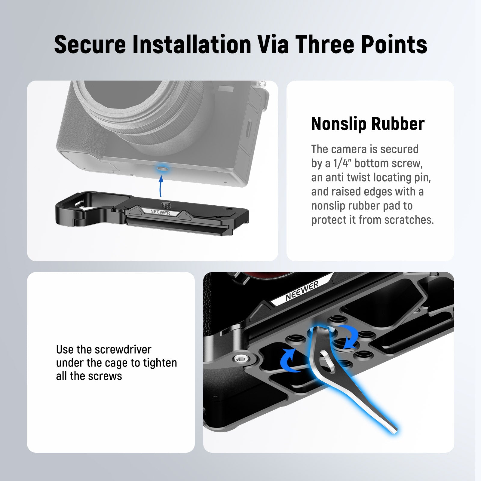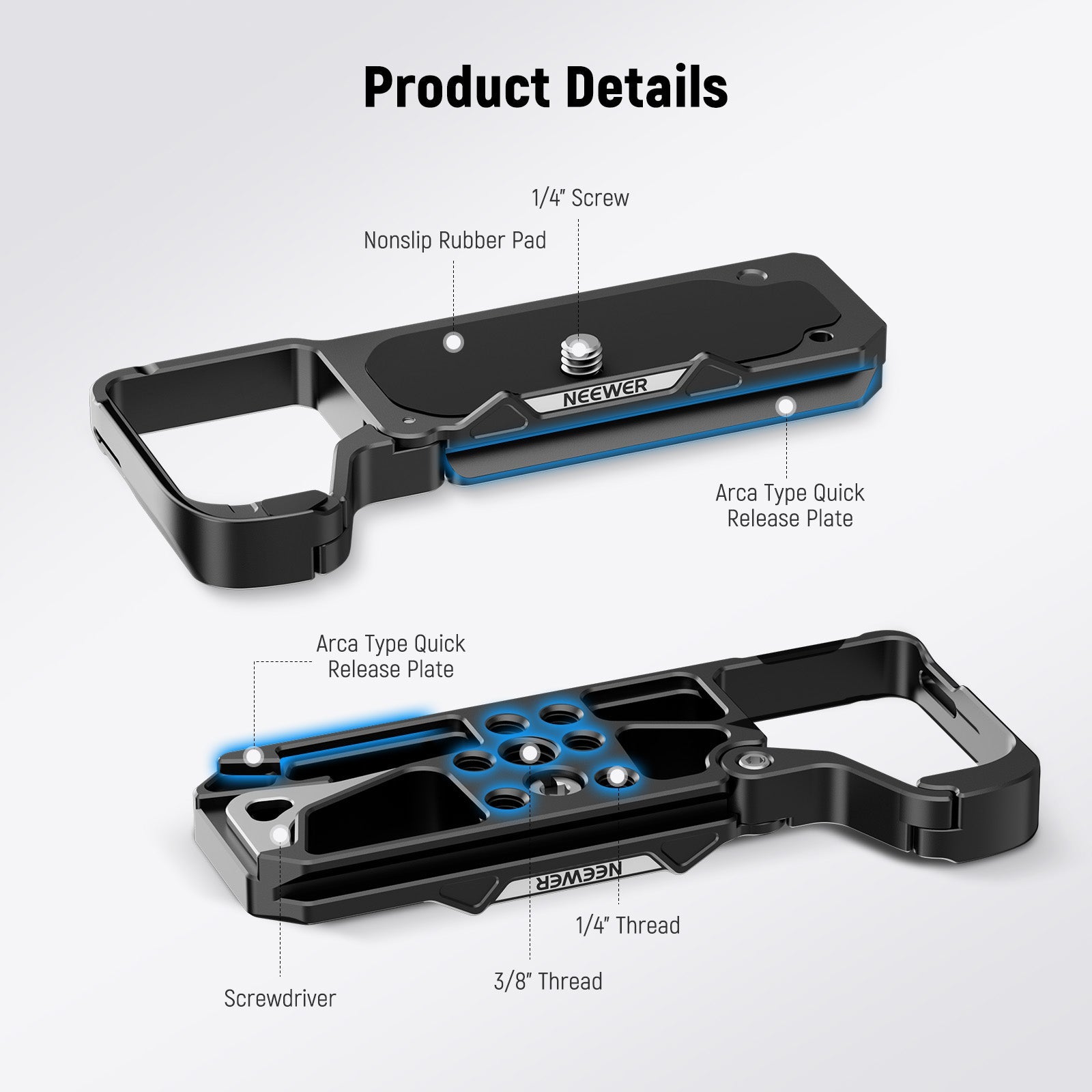 - Fixation pratique et sécurisée : fixez votre appareil photo en toute sécurité grâce à la vis 1/4" et protégez-le des rayures grâce au patin en caoutchouc antidérapant. Utilisez la clé située sous la plaque de base pour serrer la vis.