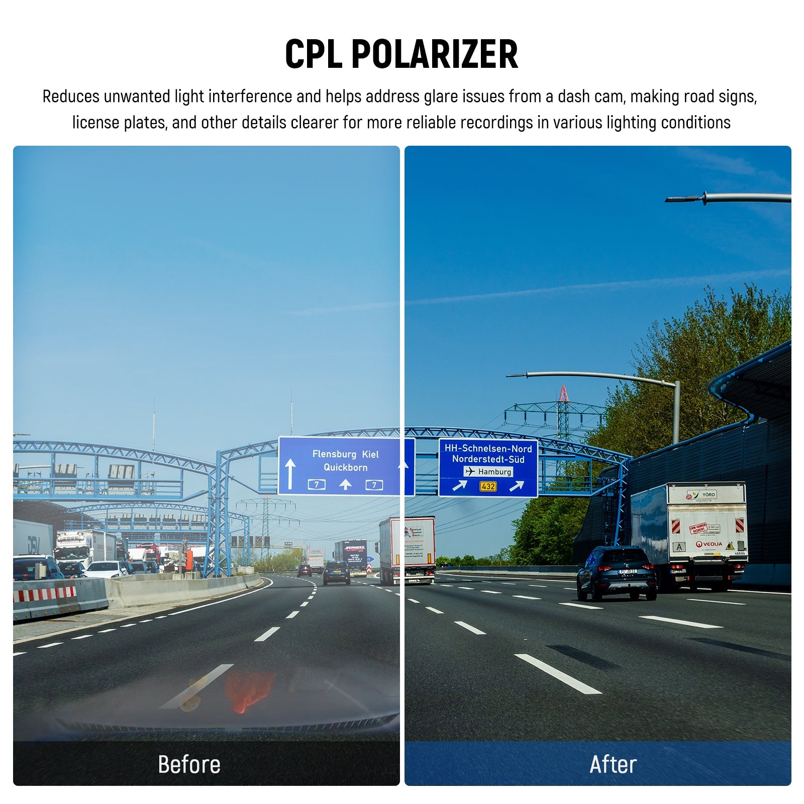 - Réduction des reflets sur les surfaces non métalliques : le filtre polarisant circulaire minimise les reflets sur les vitres de voiture, l’eau et les surfaces lisses, à l’instar d’un filtre polarisant. Il réduit les interférences lumineuses indésirables et contribue à atténuer les problèmes d’éblouissement de la caméra embarquée, rendant ainsi les panneaux de signalisation, les plaques d’immatriculation et autres détails plus nets pour des enregistrements plus fiables dans diverses conditions d’éclairage.
