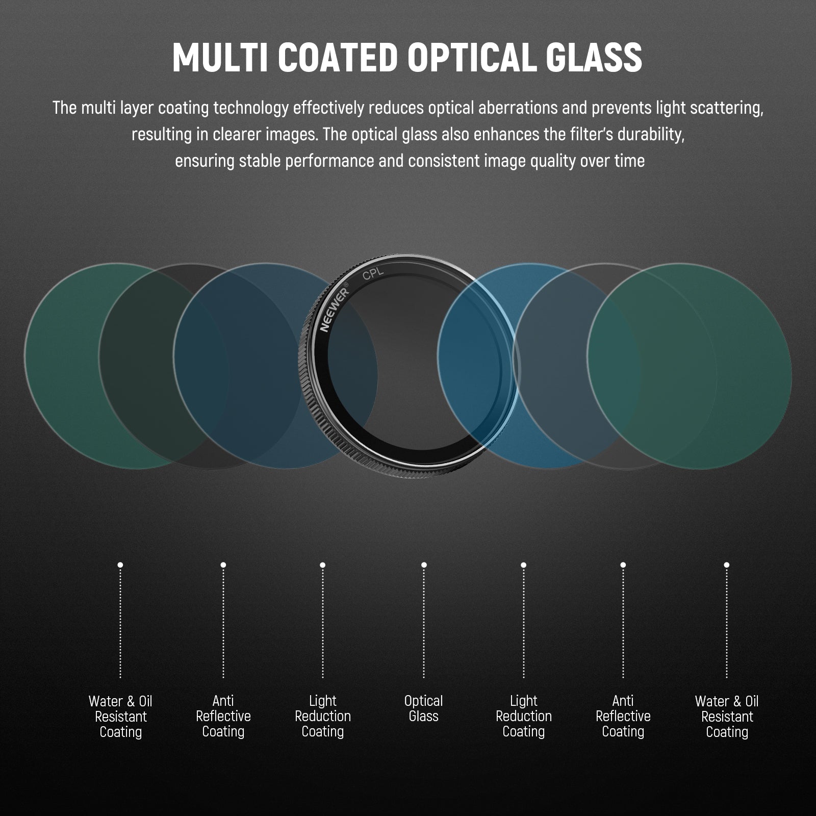 - Verre optique multicouche – La technologie de revêtement multicouche réduit efficacement les aberrations optiques et empêche la diffusion de la lumière, pour des images plus nettes. Le verre optique de haute qualité renforce également la durabilité du filtre, garantissant des performances stables et une qualité d'image constante dans le temps.