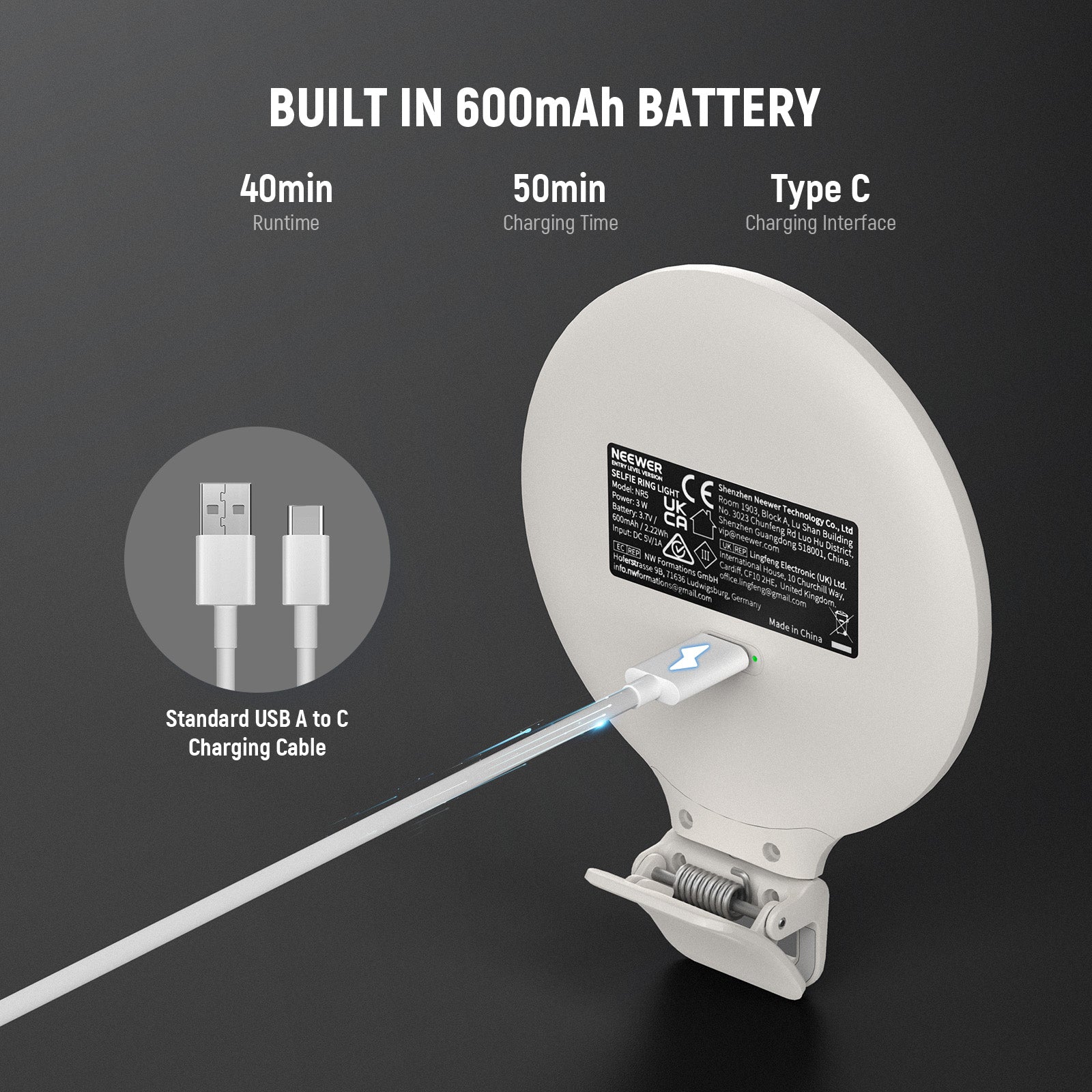 • Batterie rechargeable intégrée – Contrairement aux anneaux lumineux USB classiques pour visioconférence, le NR5 est doté d'une batterie intégrée de 600 mAh offrant jusqu'à 40 minutes d'éclairage continu à pleine luminosité après une charge complète, vous libérant ainsi des contraintes liées au branchement d'un câble d'alimentation. Le rechargement complet ne prend qu'environ 50 minutes grâce au câble de charge USB Type-C fourni, via un chargeur portable ou toute autre source d'alimentation USB.