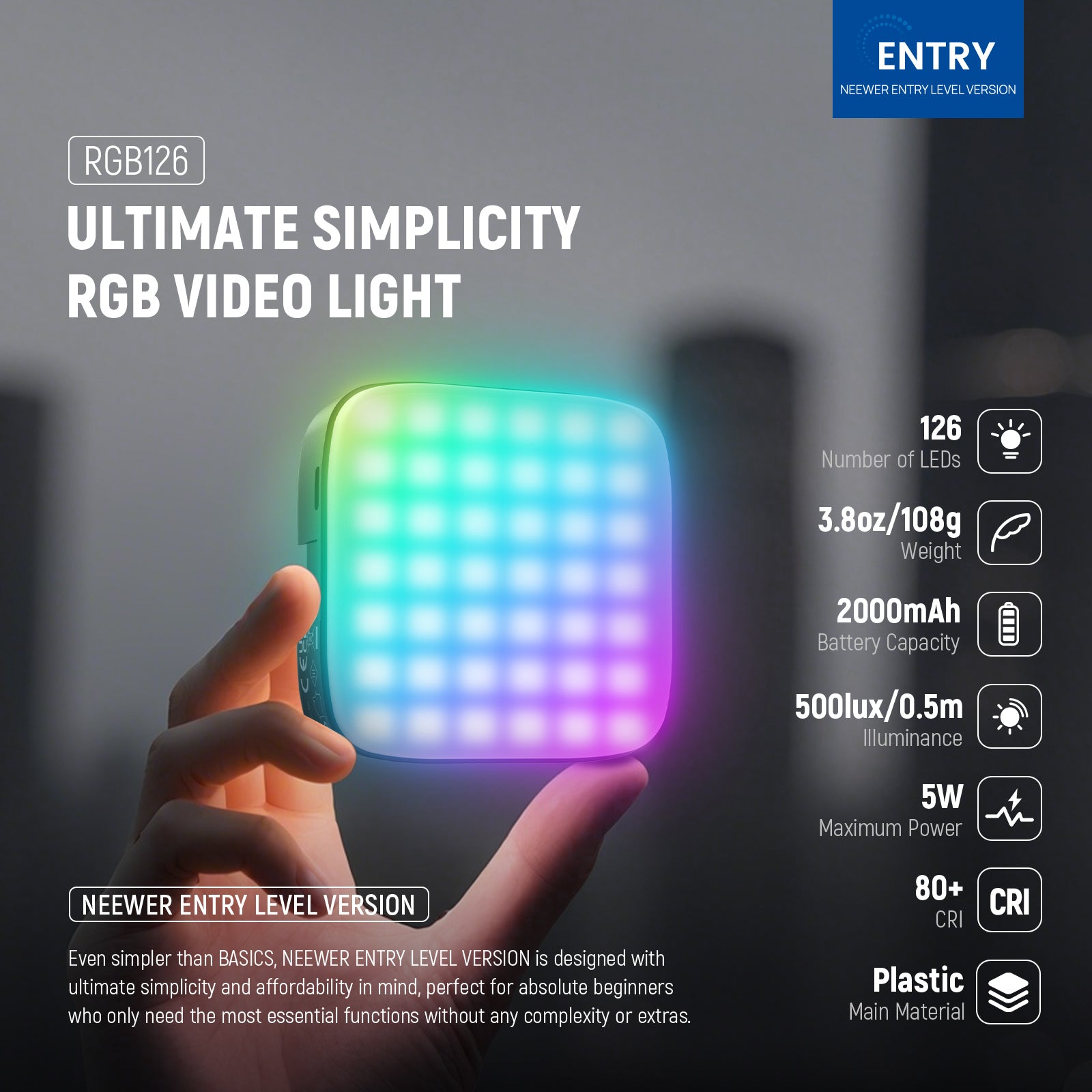 - Présentation de la version d'entrée de gamme NEEWER : encore plus simple que la version BASICS, la version d'entrée de gamme NEEWER est conçue pour une simplicité et un prix abordable optimaux. Elle est idéale pour les débutants qui n'ont besoin que des fonctions essentielles, sans complexité ni superflu. Remarque : pendant la charge, la puissance du RGB126 est automatiquement réduite à 3,5 W.