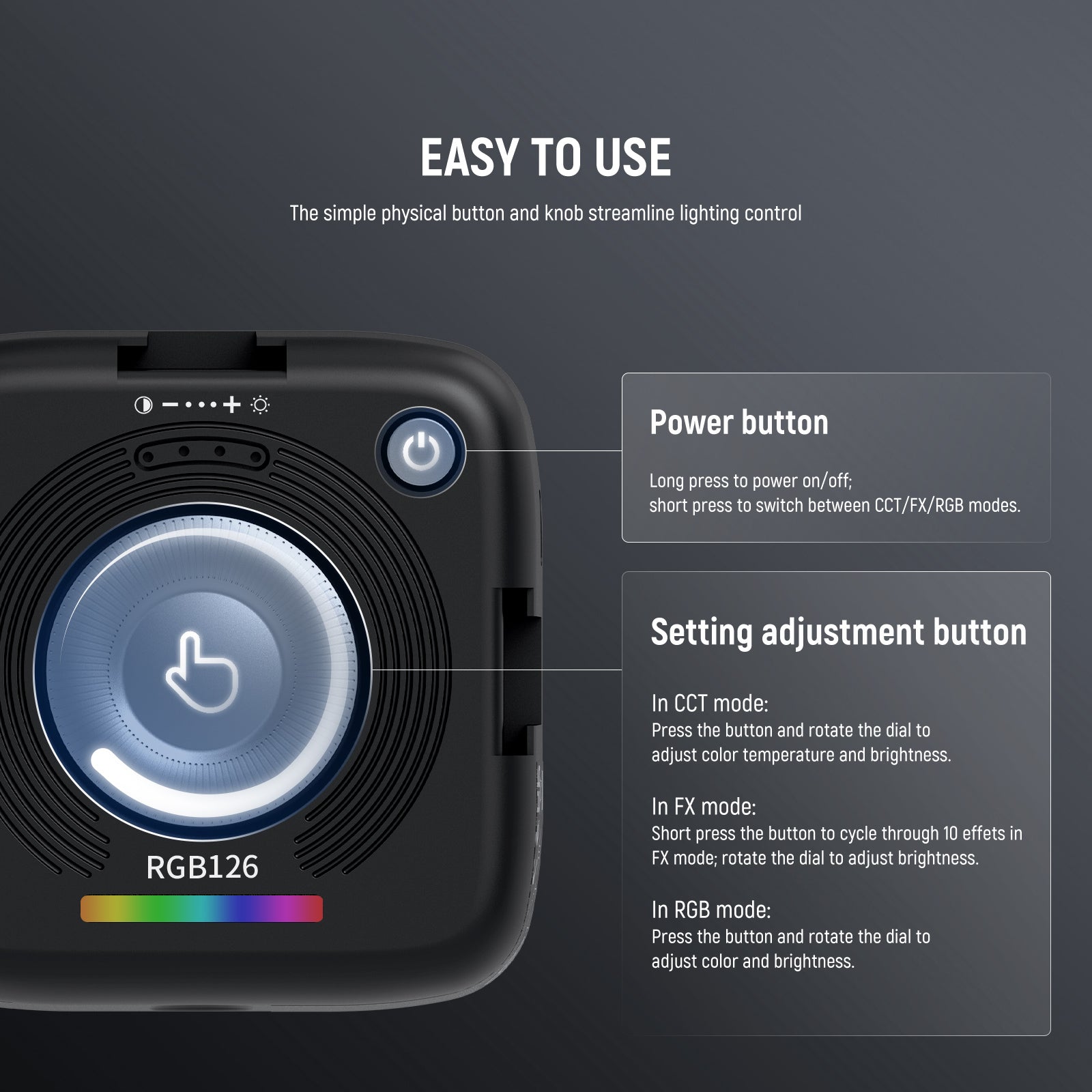 - Éclairage compact et portable pour appareil photo - Le RGB126 est un mini panneau LED cubique de poche, idéal pour la photographie. Mesurant 76 x 76 x 35 mm (3" x 3" x 1,4"), il ne pèse que 108 g (3,8 oz) avec son diffuseur. Il peut être fixé à un ordinateur portable ou magnétiquement pour immortaliser vos plus beaux moments, en tant qu'éclairage principal ou d'appoint. Son bouton et sa molette physiques simplifient le contrôle de la lumière. Un accessoire indispensable pour les selfies des créateurs de contenu, maquilleurs, streamers et influenceurs.