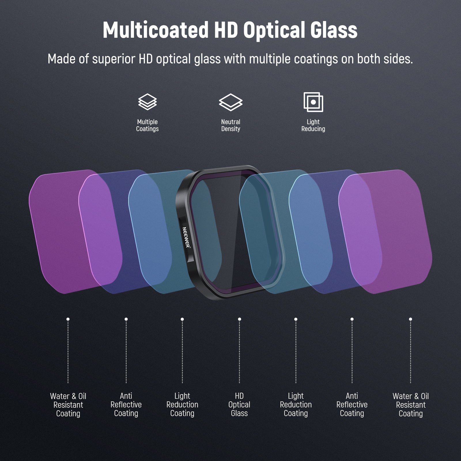 - Verre optique HD multicouches : le verre optique HD garantit une clarté exceptionnelle et une reproduction fidèle des couleurs. Ses multiples traitements multicouches sur les deux faces du verre le rendent résistant à l’eau, aux traces de doigts, aux taches et aux rayures, facilitant ainsi le nettoyage des filtres (chiffon de nettoyage inclus).