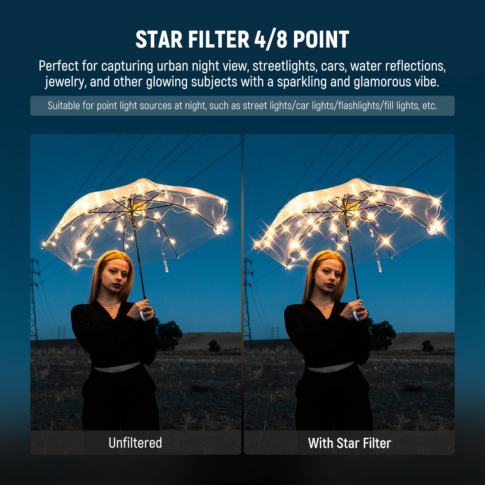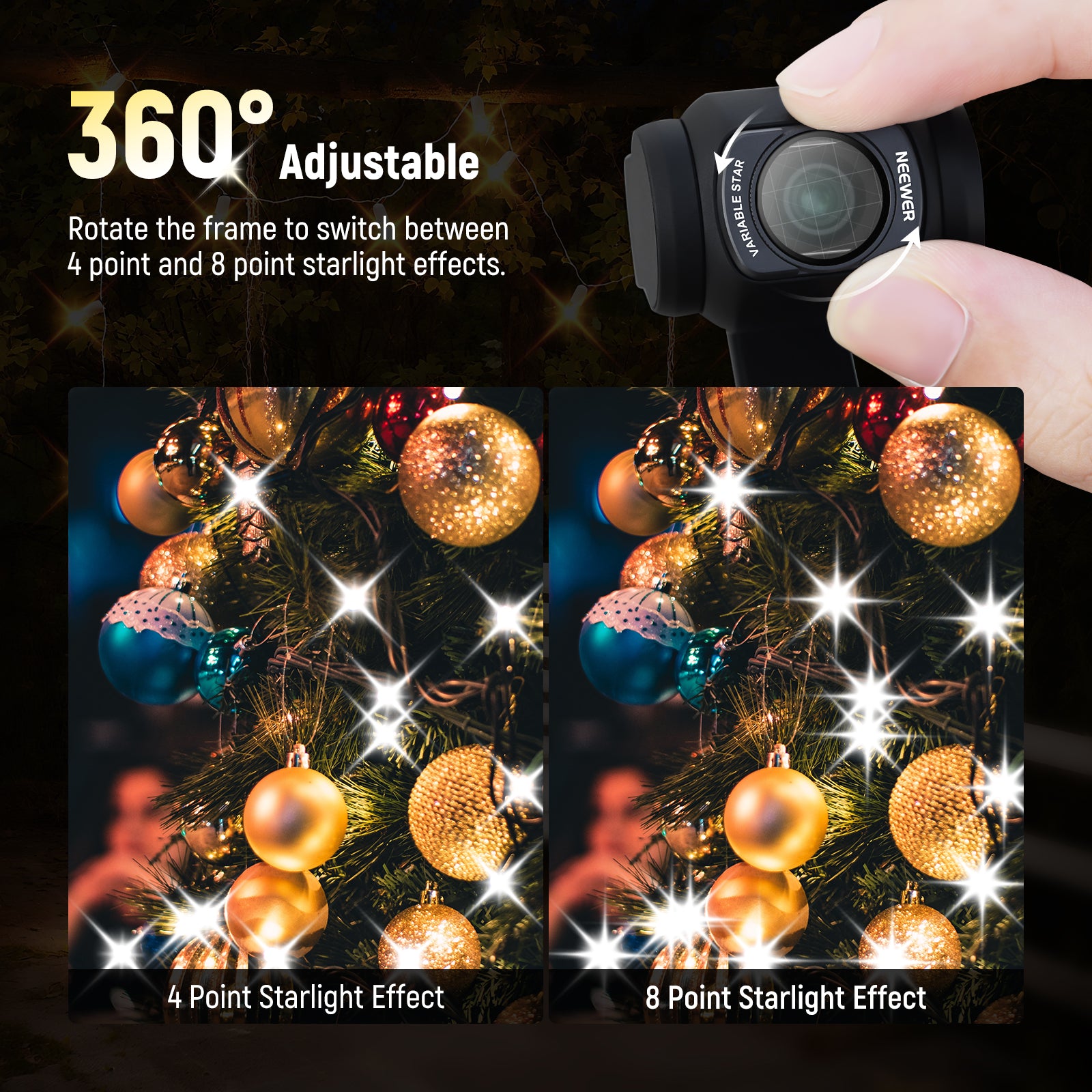 - Filtre étoile réglable 4/8 points - Ce filtre étoile réglable (FL-C38) est doté d'un cadre extérieur rotatif permettant de choisir entre un effet d'étoile à 4 ou 8 points. Idéal pour immortaliser les scènes nocturnes urbaines, les lampadaires, les voitures et les reflets sur l'eau avec une ambiance scintillante et glamour.