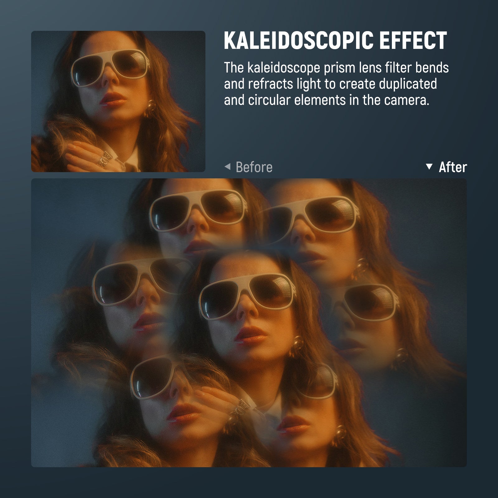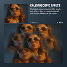 - Effet kaléidoscopique créatif - Le filtre à lentille prismatique kaléidoscopique (FL-C39) courbe et réfracte la lumière pour créer des éléments circulaires dupliqués dans l'image. En modifiant l'angle d'incidence, il diffuse également la lumière et crée un effet kaléidoscopique hypnotique et surréaliste. Faites pivoter le filtre pour obtenir les effets souhaités.