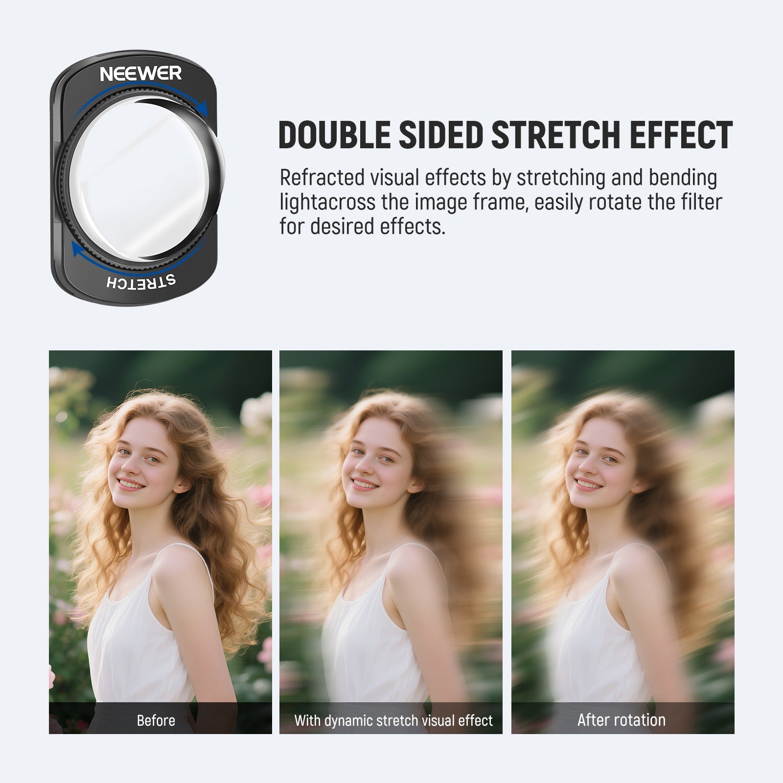 - Effet visuel d'étirement dynamique - Ce filtre d'étirement double face (FL-C37) crée des effets visuels dynamiques, déformés et réfractés en étirant et en courbant la lumière sur l'image. Idéal pour la photographie et la vidéographie cinématographiques, il ne nécessite aucun montage. Faites pivoter le filtre pour obtenir l'effet désiré.