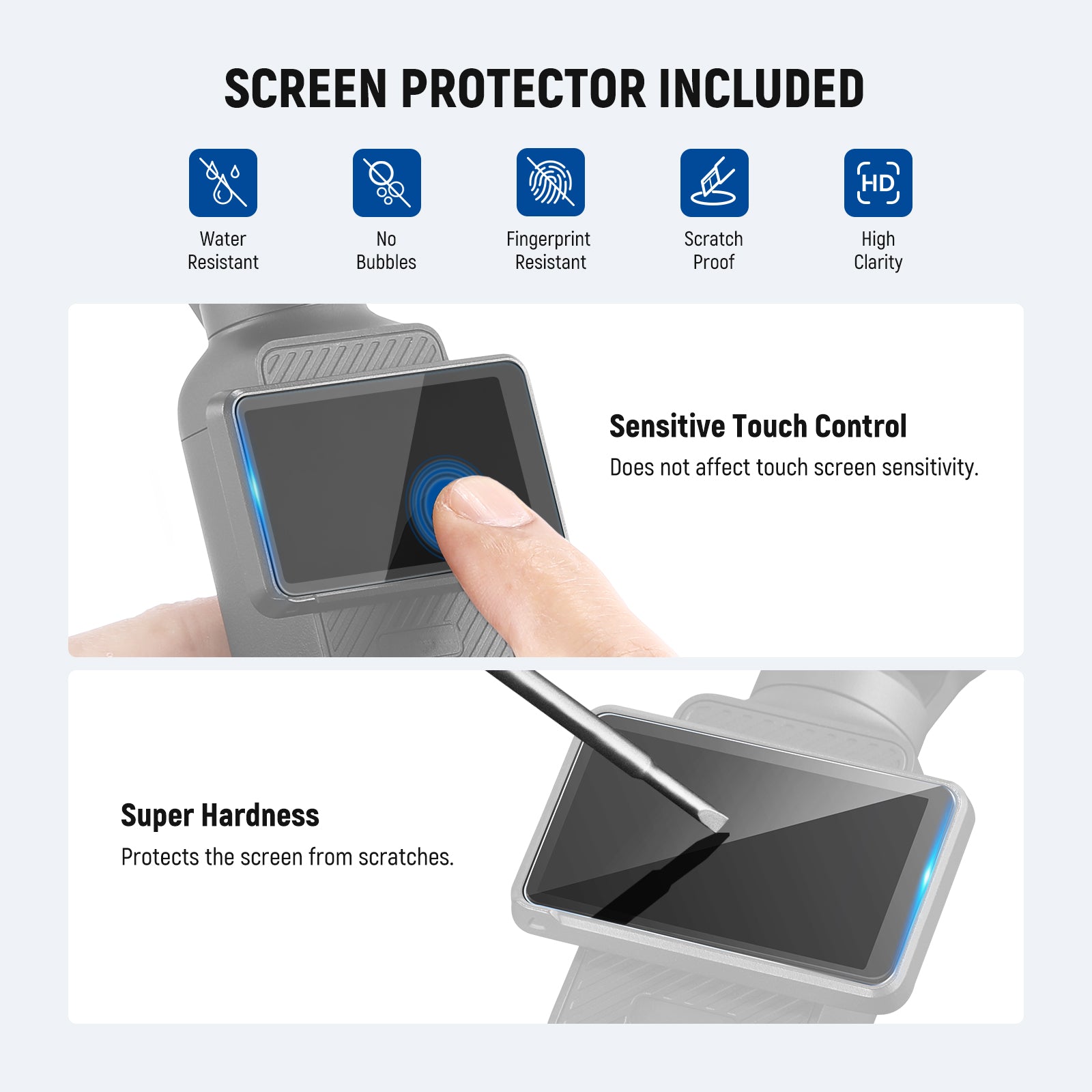 - Verre optique HD multicouches : le verre optique HD garantit une qualité d’image supérieure. Ses multiples couches protectrices résistent à l’eau, aux traces de doigts et aux rayures. Un chiffon de nettoyage est fourni pour l’entretien quotidien, ainsi qu’un film protecteur pour protéger l’écran tactile des rayures tout en préservant sa réactivité.