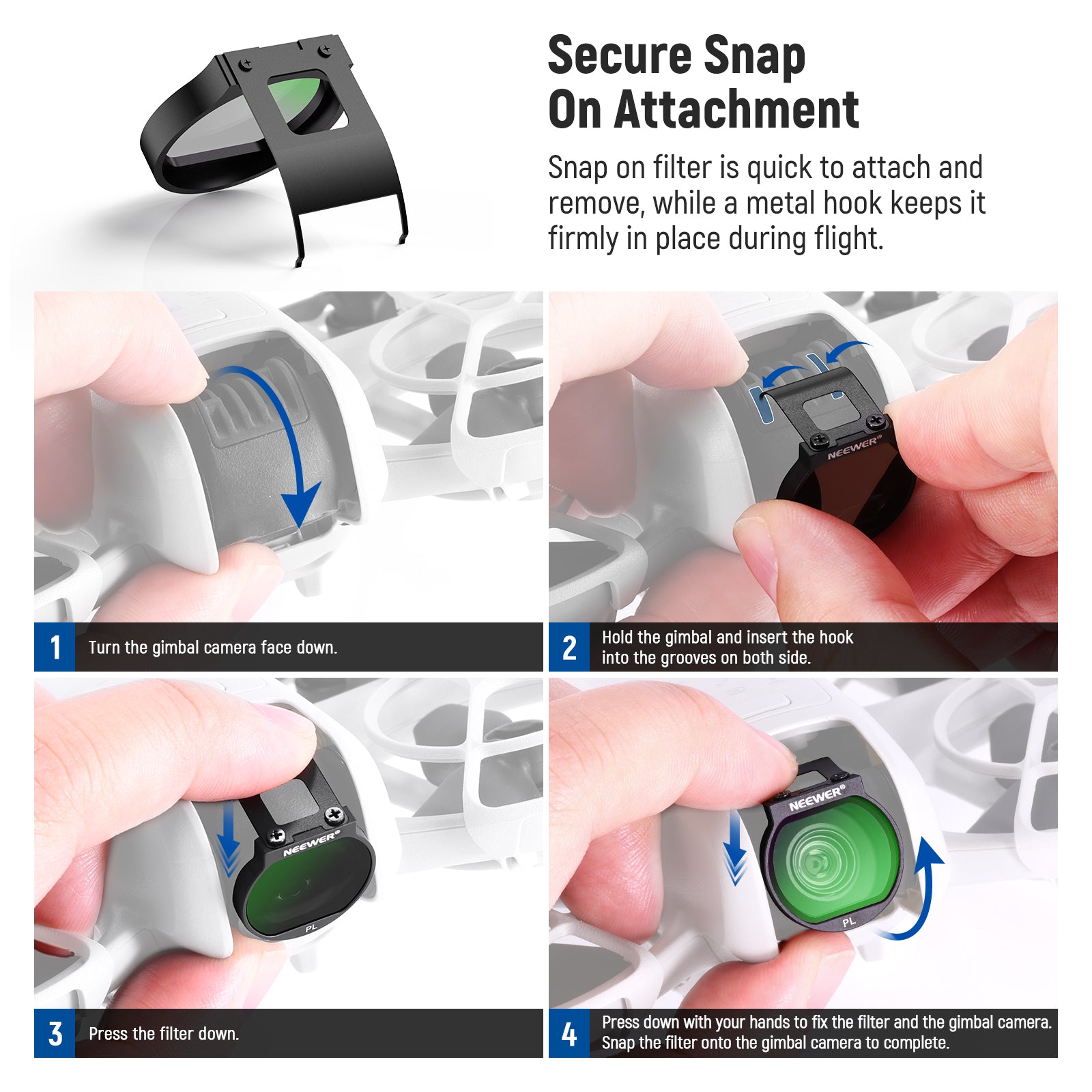 - Fixation sécurisée par clip – Le filtre se fixe et se retire rapidement, tandis qu'un crochet métallique le maintient fermement en place pendant le vol. Son design fin évite le vignettage sur la caméra et n'affecte pas l'utilisation du protège-nacelle.