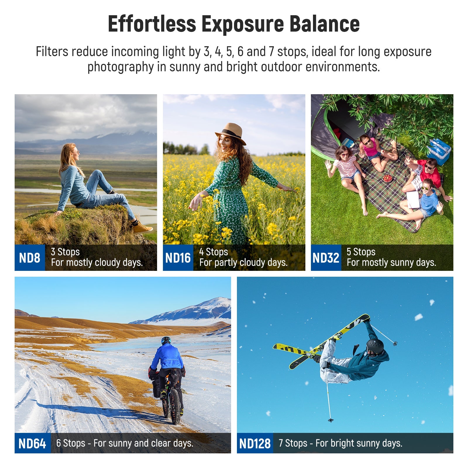 - Équilibre d'exposition sans effort : cinq filtres ND (ND8, ND16, ND32, ND64 et ND128) réduisent la lumière de 3, 4, 5, 6 et 7 diaphragmes respectivement, ce qui est idéal pour la photographie à longue exposition en extérieur par forte luminosité. Ils permettent de photographier à des vitesses d'obturation plus lentes avec de plus grandes ouvertures et de capturer les mouvements avec des effets de flou de mouvement expressifs.